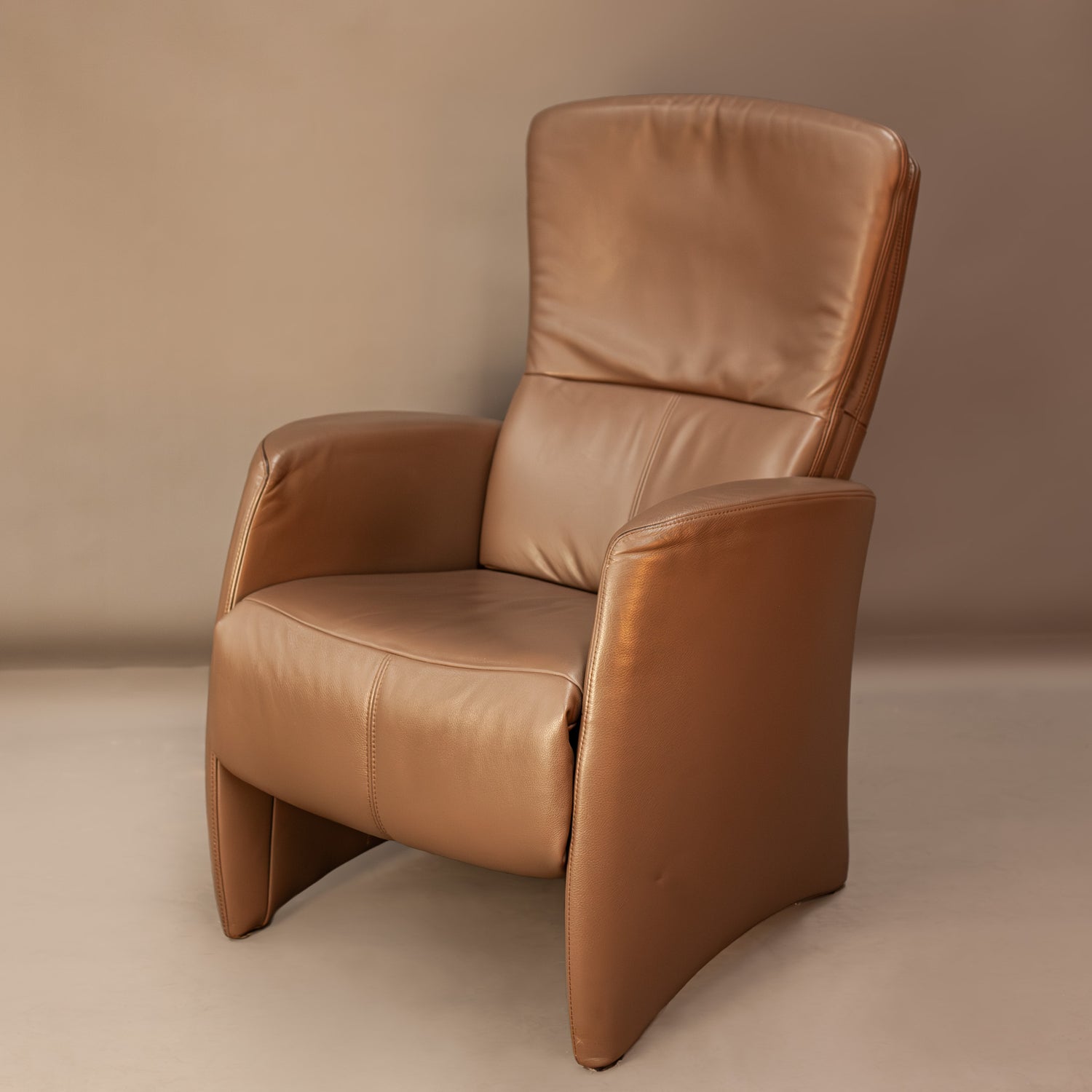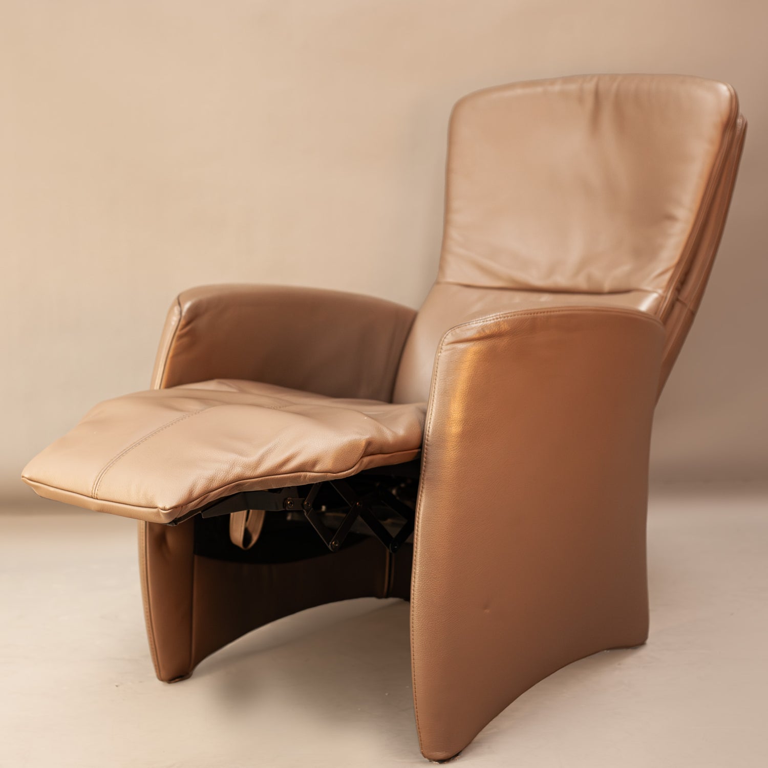 Modern JORI type recliner made of natural leather, with manual adjustment of the foot mechanism. The chair is in very good condition, fully functional and functions as intended.