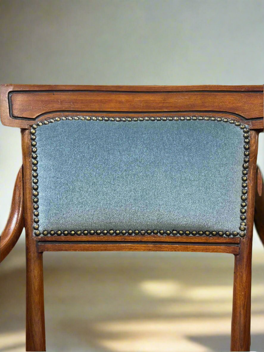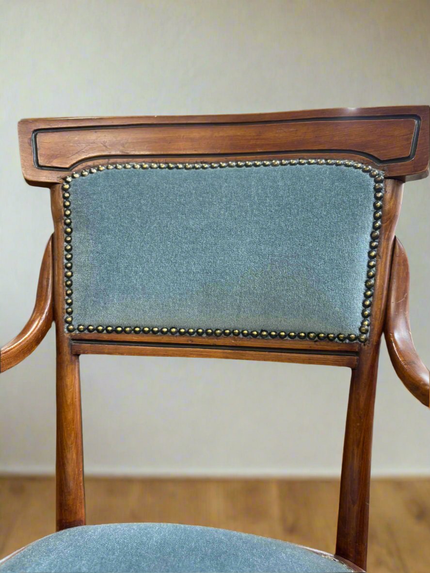 Тапицерията е в мек син кадифен дамаск, който прекрасно контрастира с топлия оттенък на дървото, подчертавайки неговата патрината и красотата на буковото дърво.