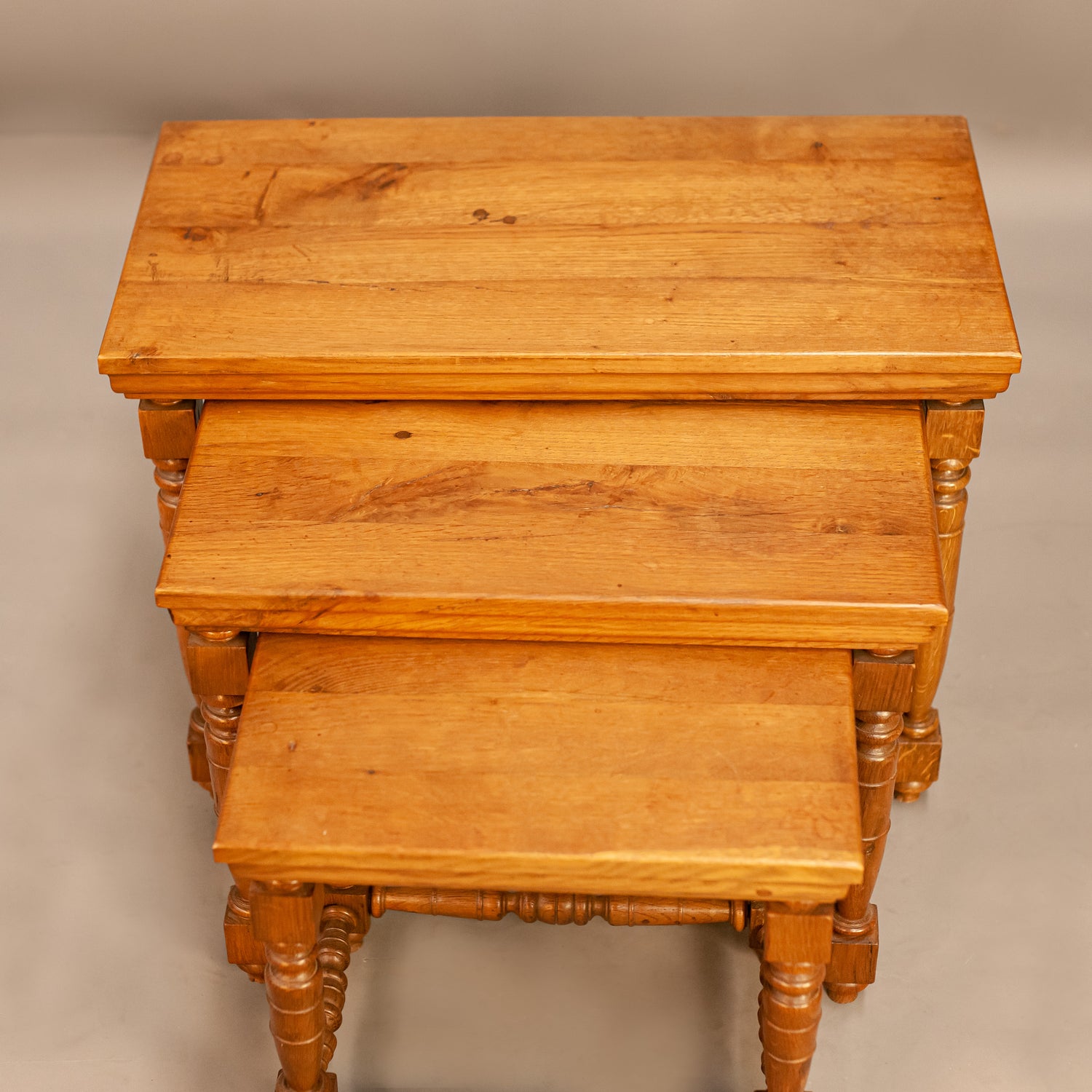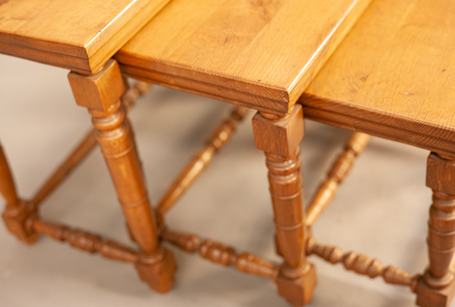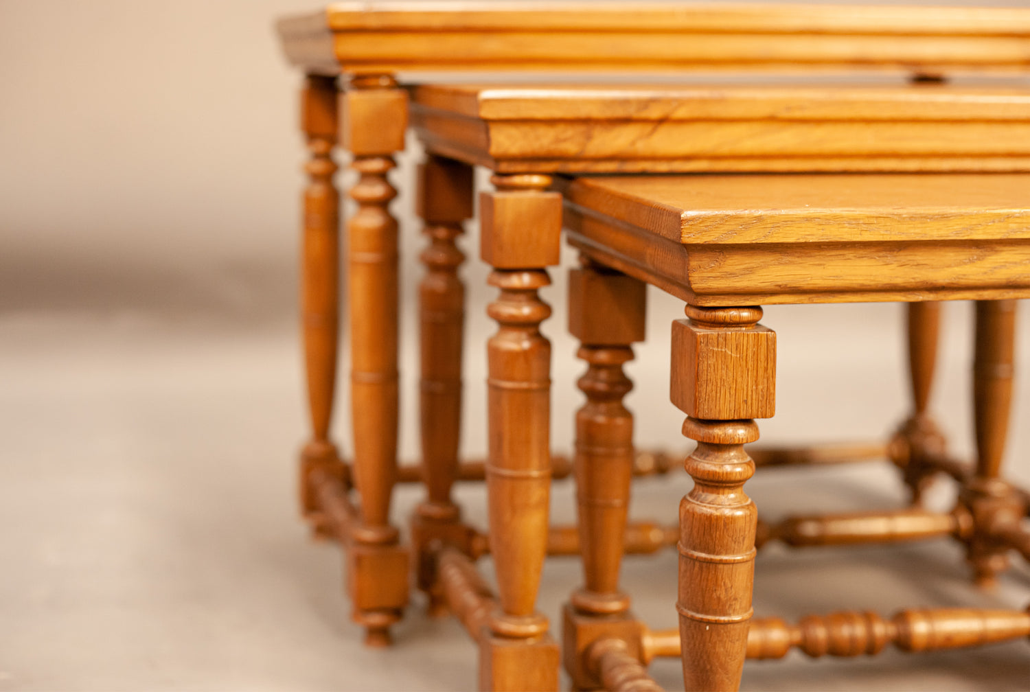 Висококачествен комплект от три масивни дъбови масички със струговани крака в отлично състояние.