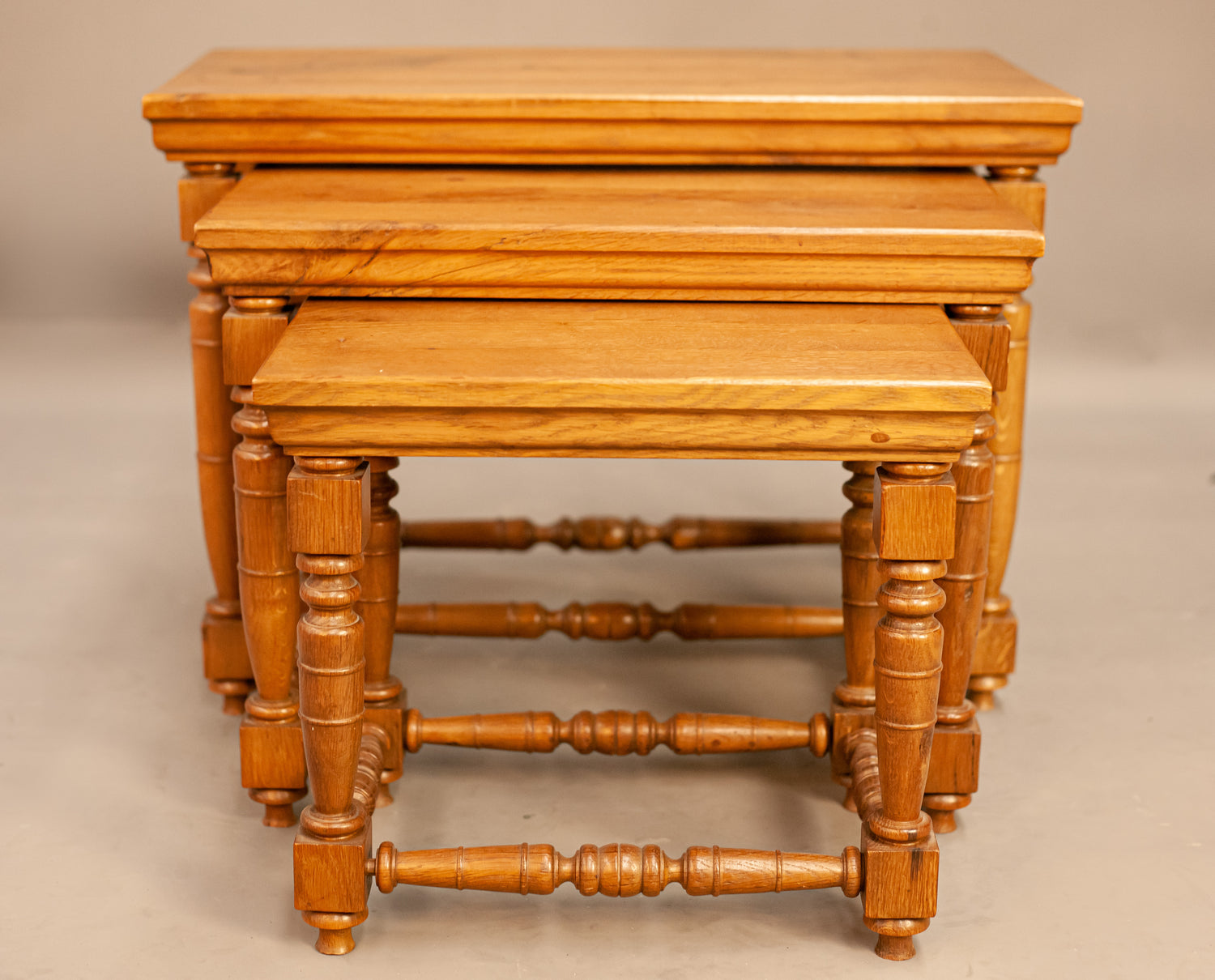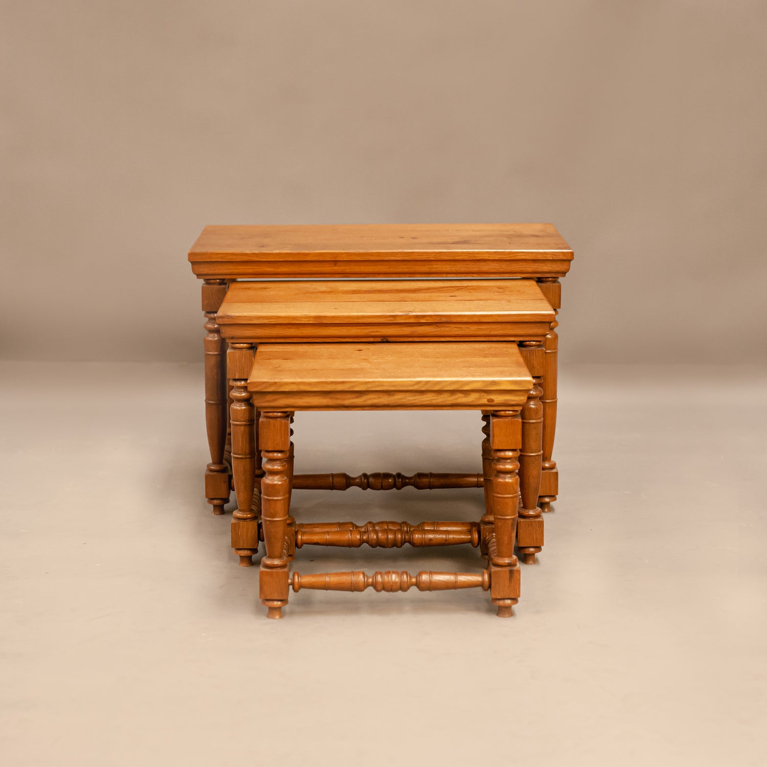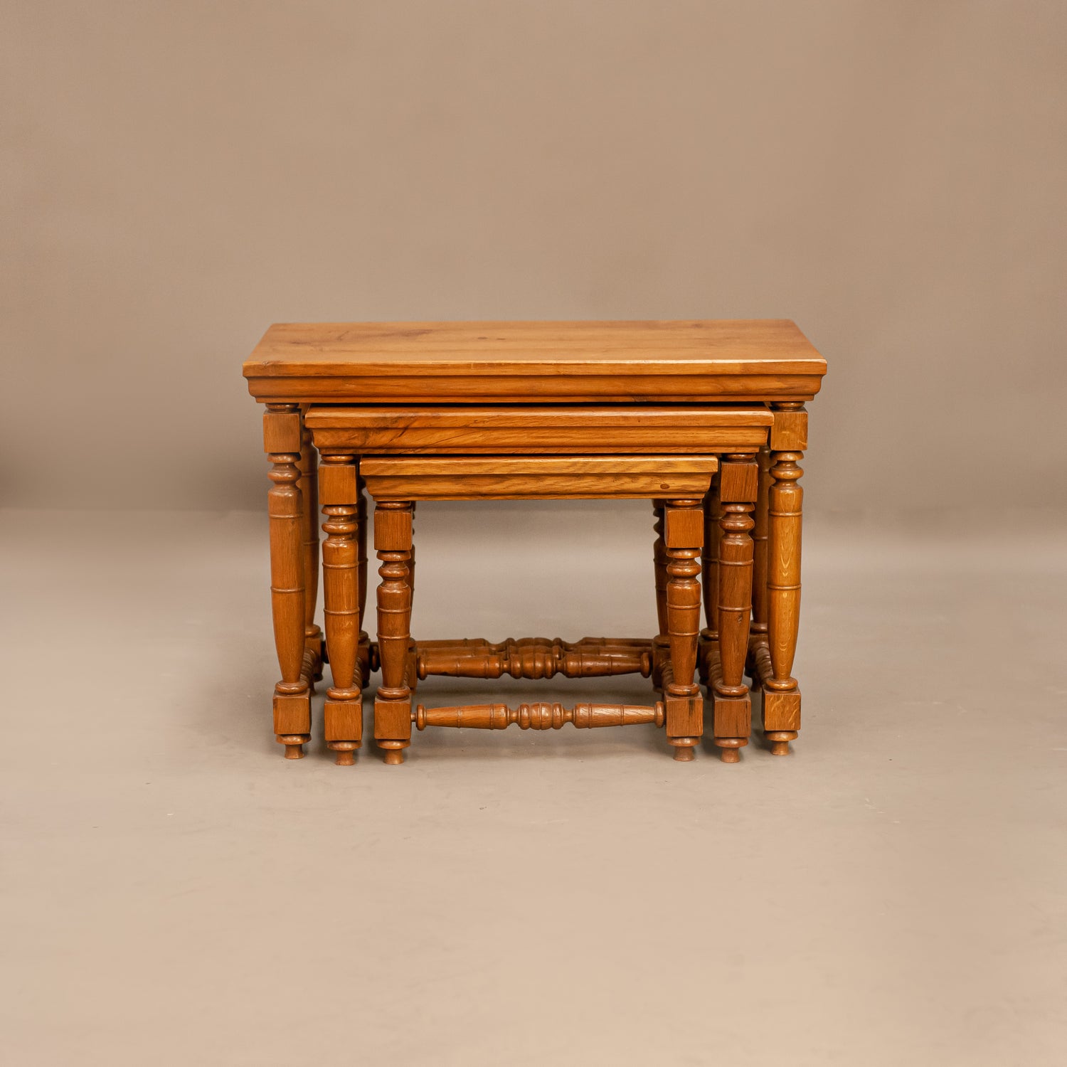 Висококачествен комплект от три масивни дъбови масички със струговани крака в отлично състояние.