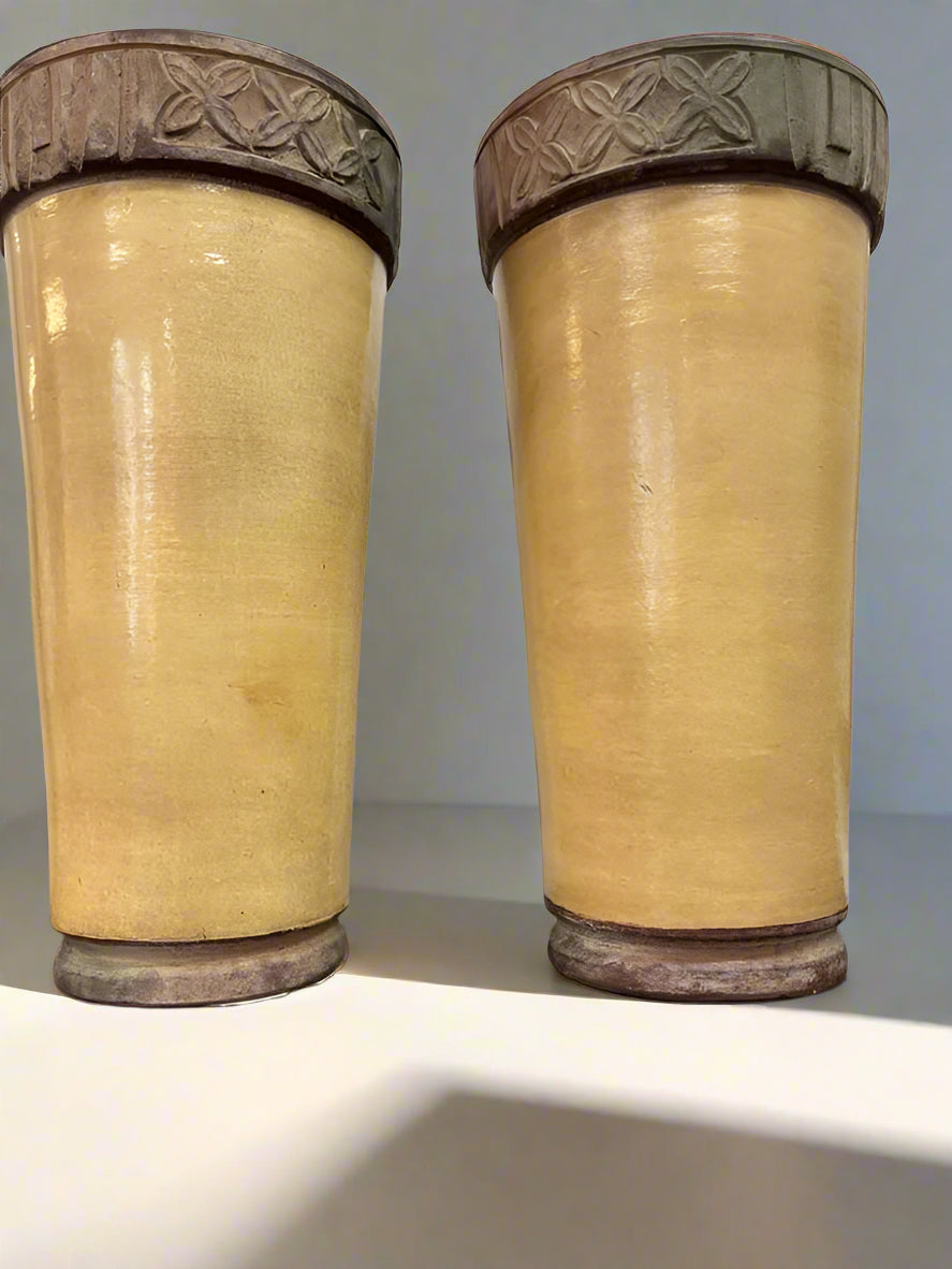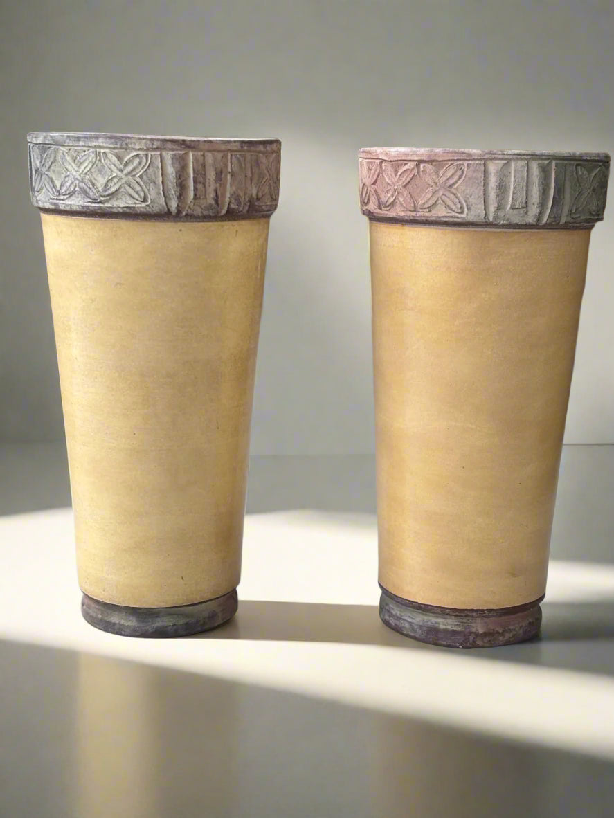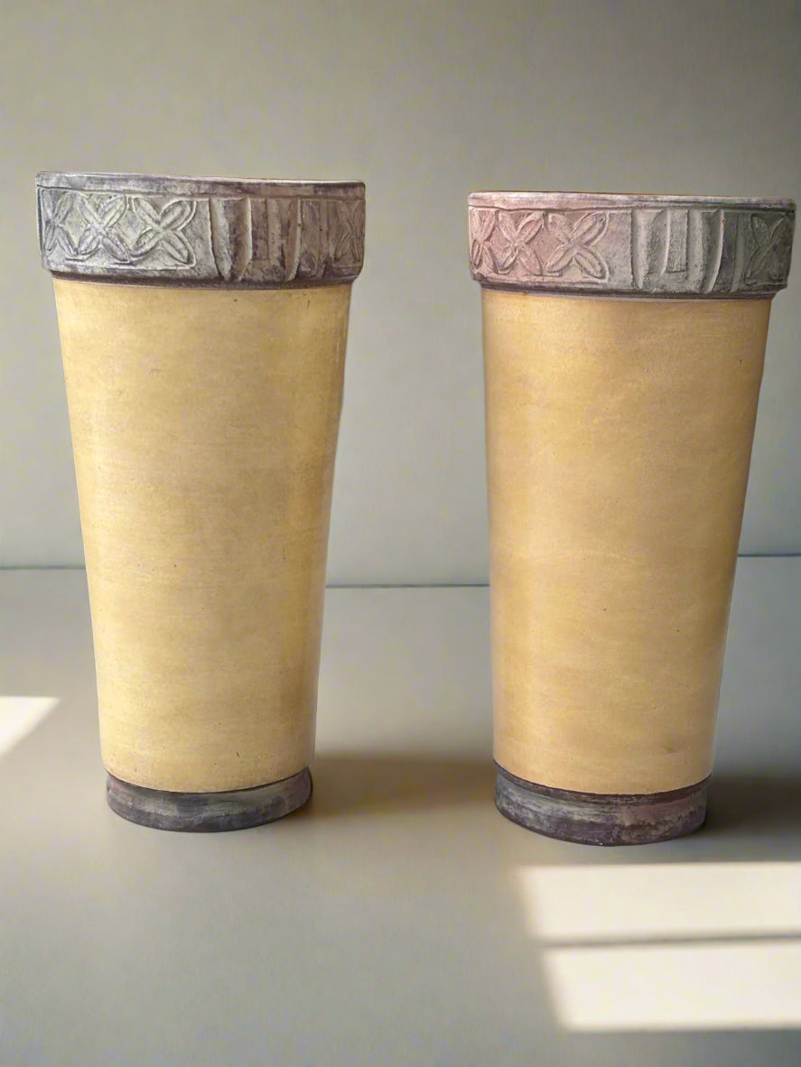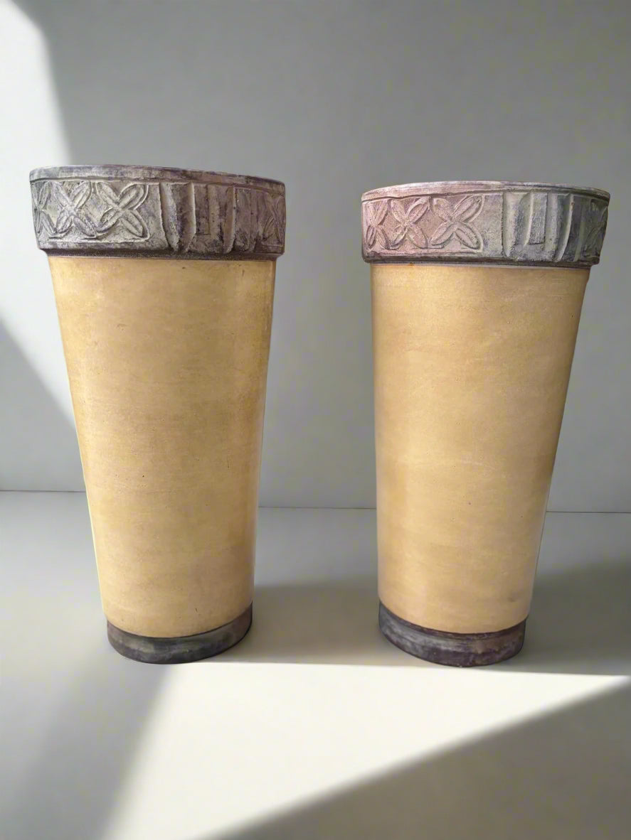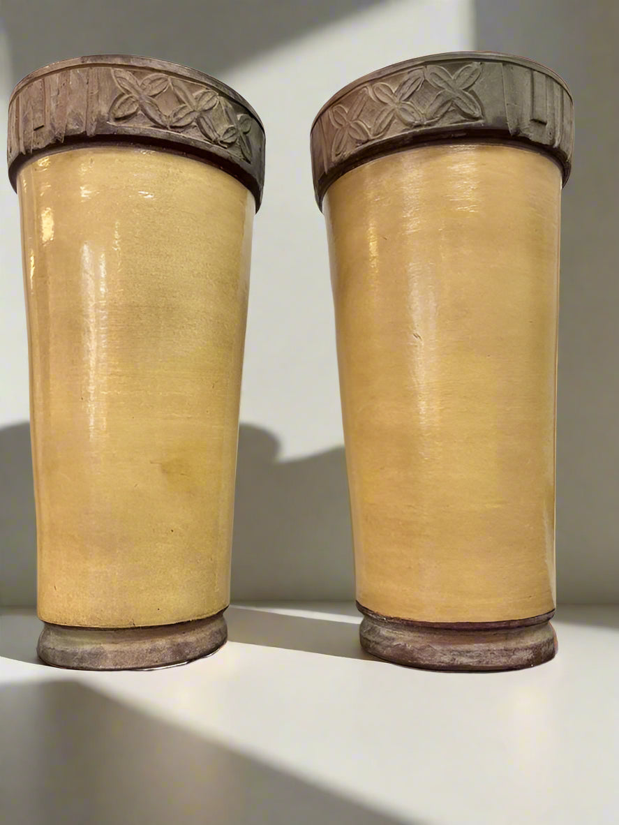Този комплект се състои от 2 броя ръчно изработени вази с красиви орнаменти по горния ръб. Подходящи са както за декорация, така и за стилен акцент във всеки интериор – класически или винтидж.