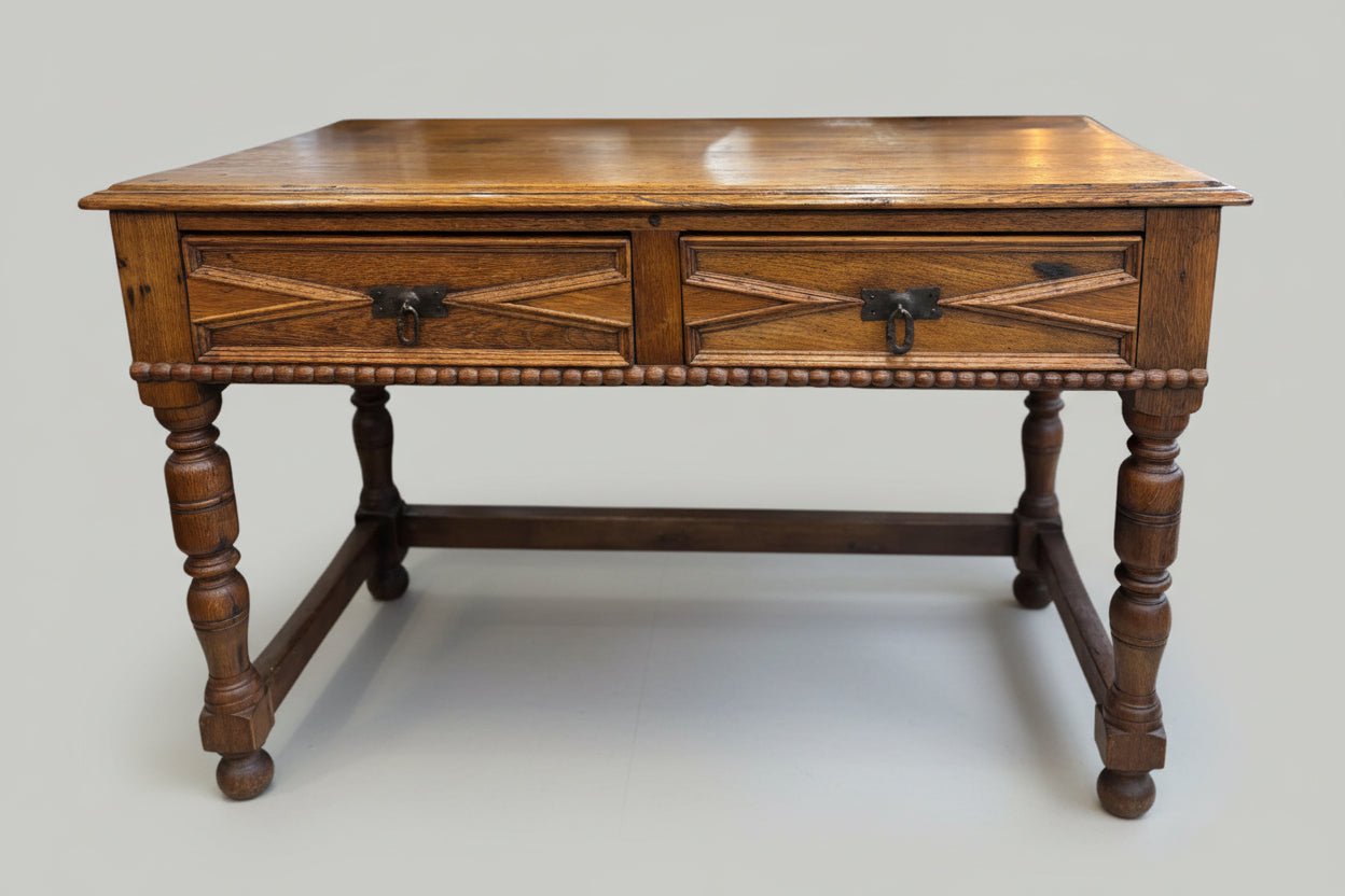 Изработена от масивен дъб с характерни геометрични панели на чекмеджетата, дебели струговани крака и долна свързваща рамка за максимална стабилност.