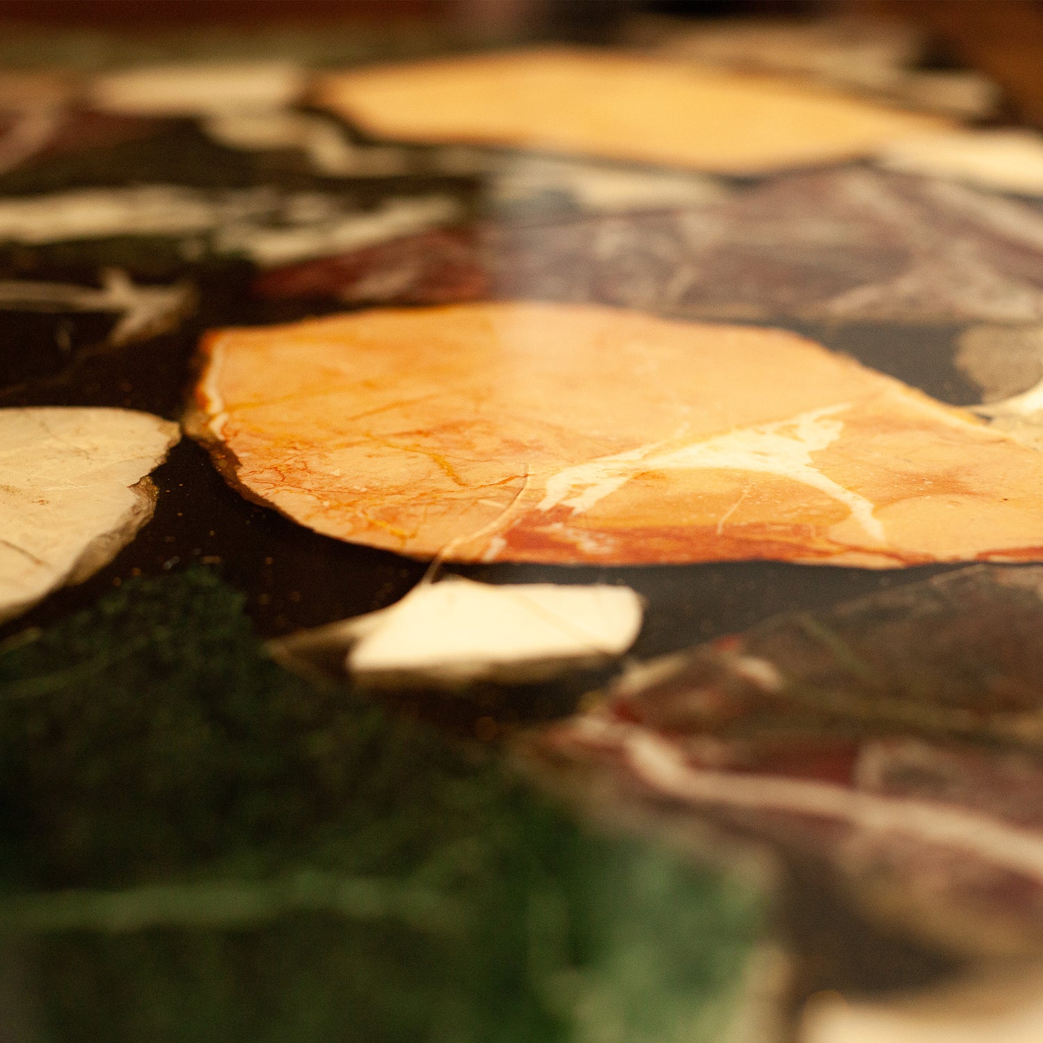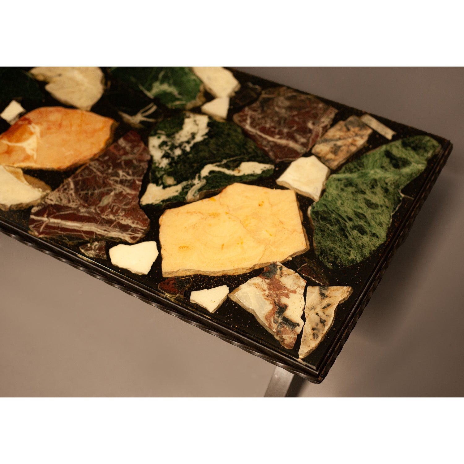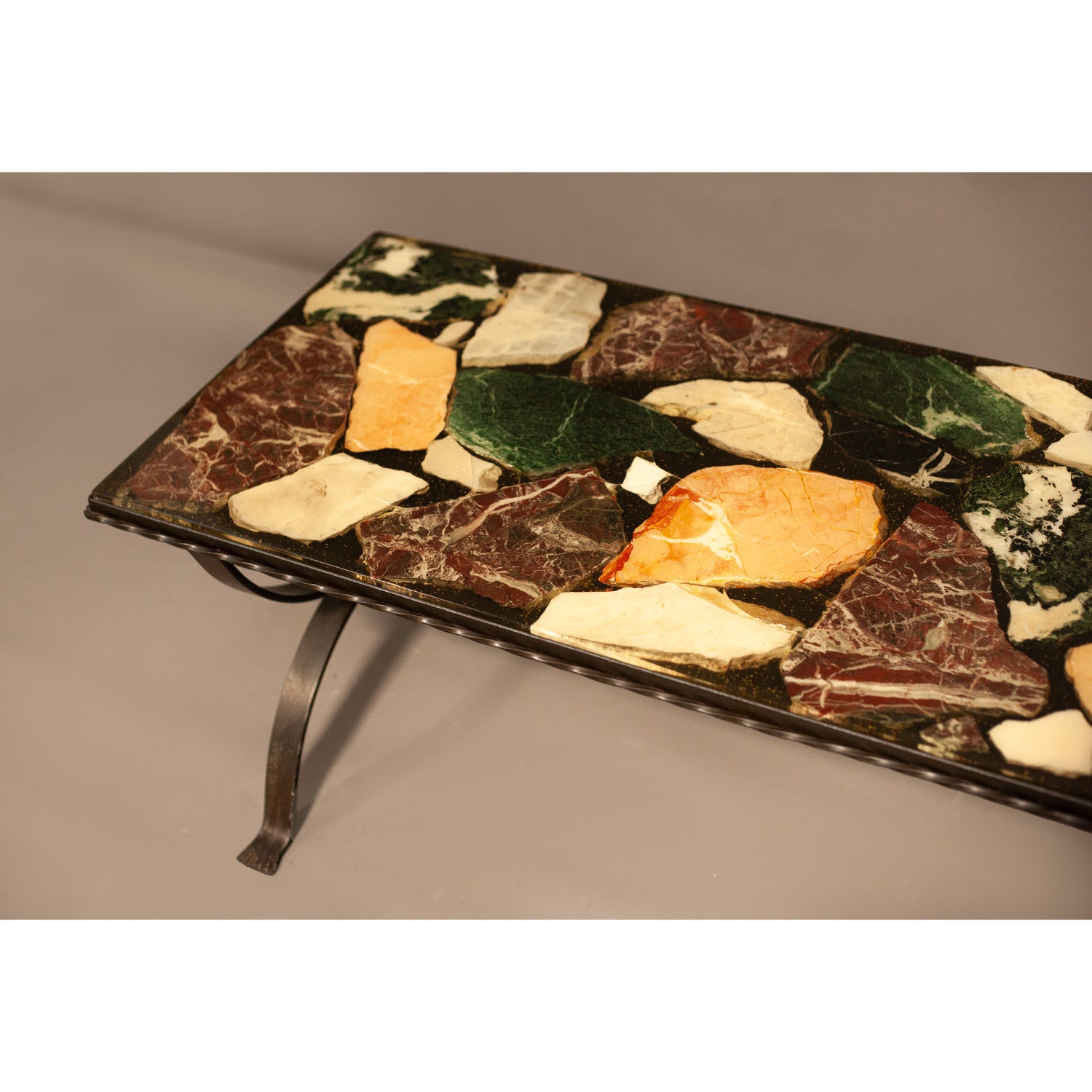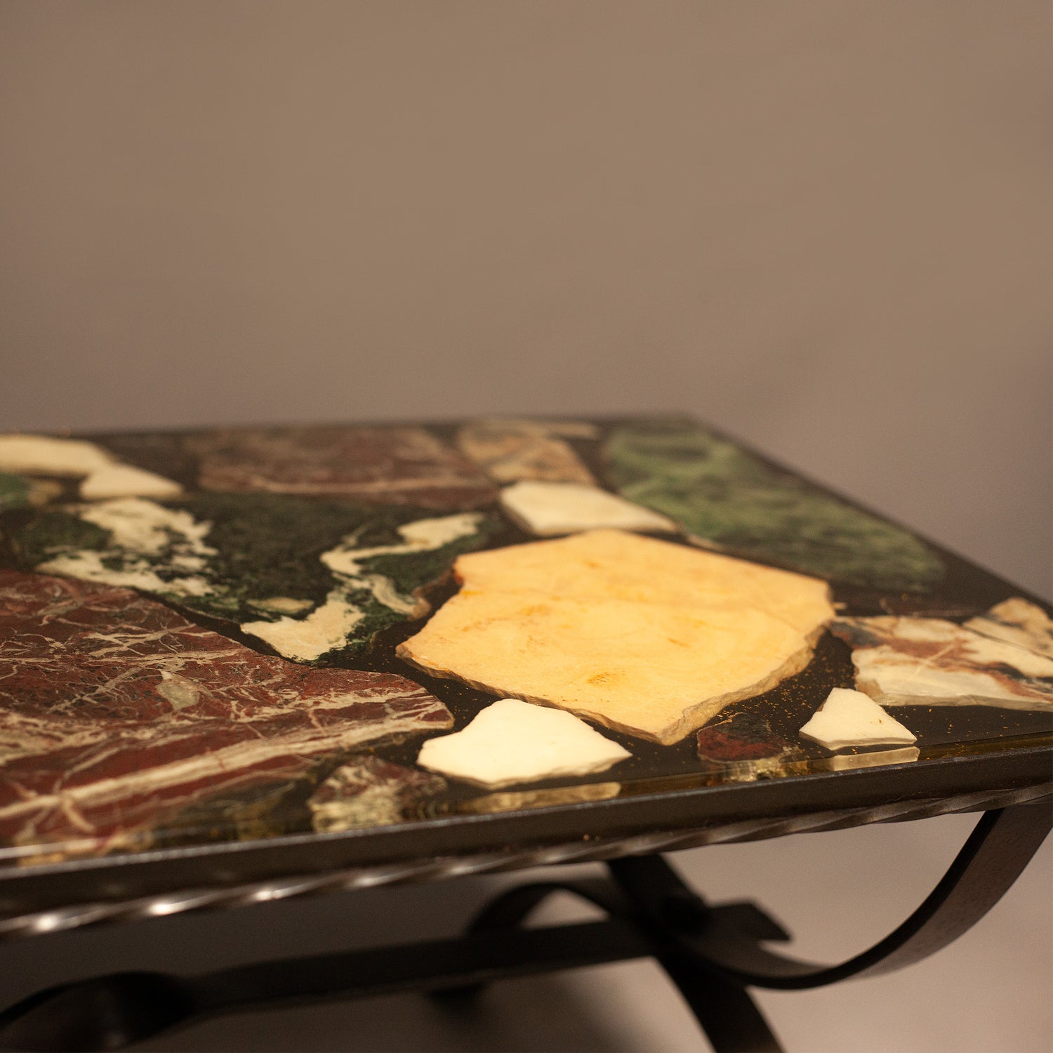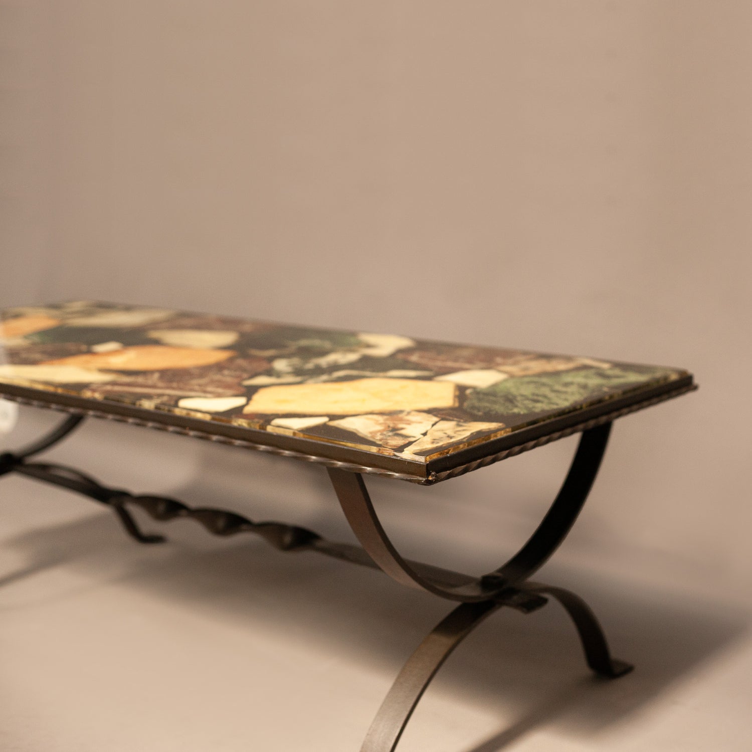 Това винтидж изделие демонстрира завладяваща комбинация от ковано желязо и многоцветен мрамор, което го превръща в истински център за вашето жилищно пространство. Със своя уникален дизайн и винтидж привлекателност тази масичка за кафе е свидетелство за непреходна красота и изключителна изработка.
