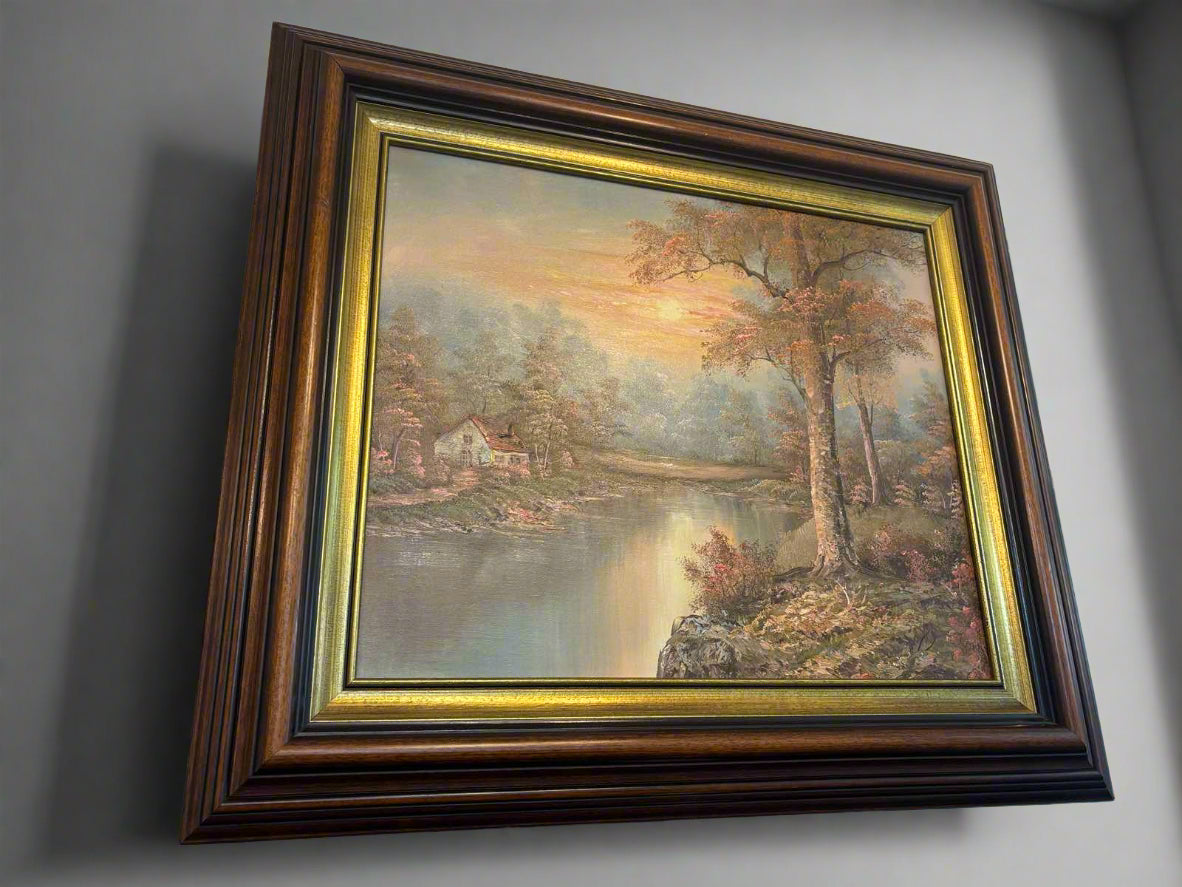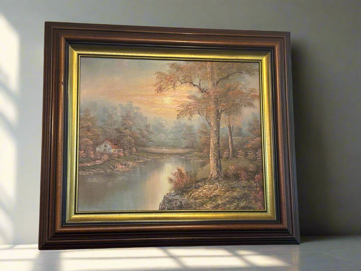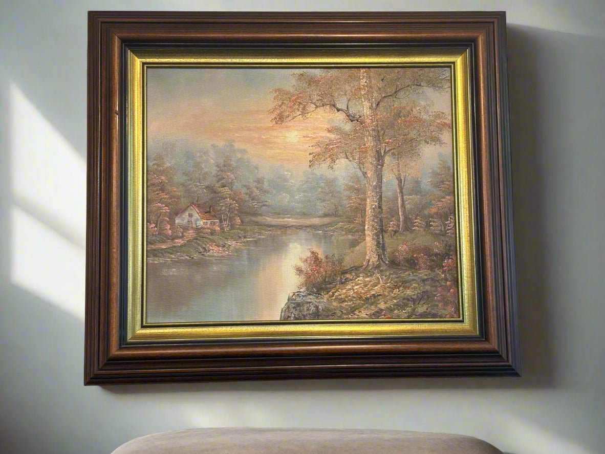 Уникална ръчно рисувана маслена картина, живопис, представяща спокоен пейзаж с река, дървета и залез – истинска хармония между природа и изкуство.