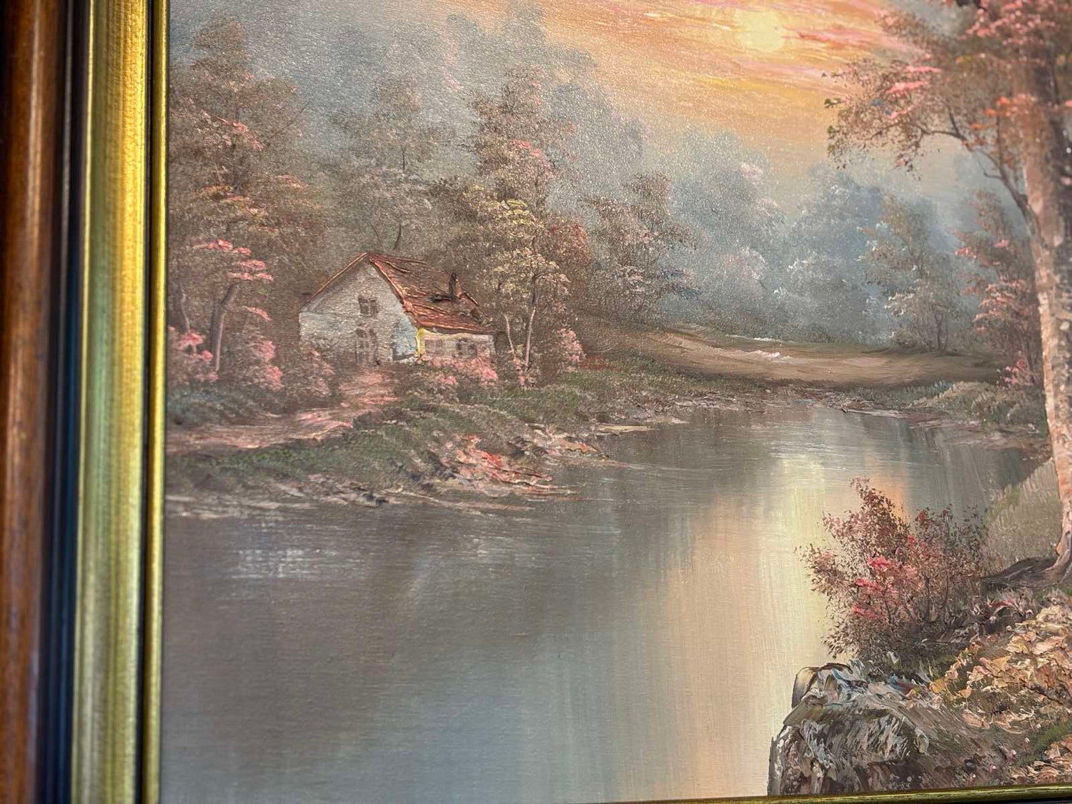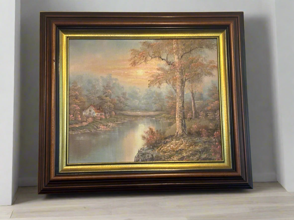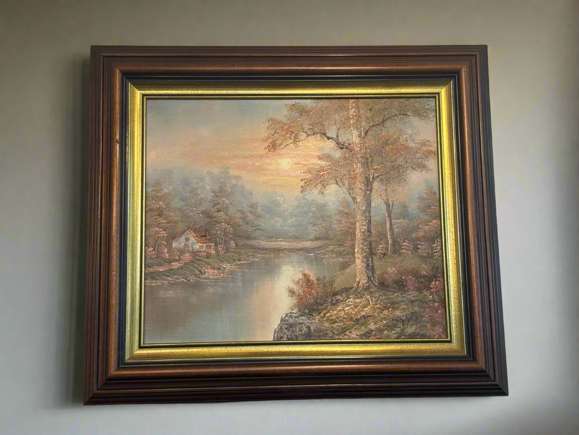 Уникална ръчно рисувана маслена картина, живопис, представяща спокоен пейзаж с река, дървета и залез – истинска хармония между природа и изкуство.