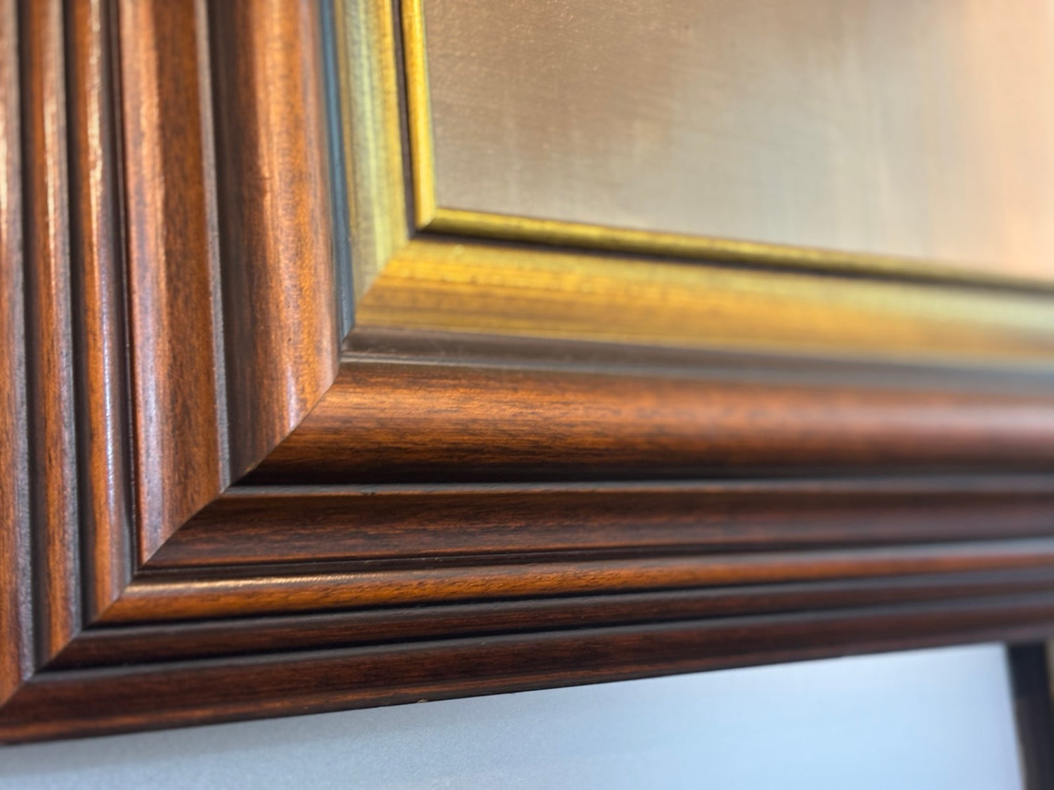 С топли, меки тонове и майсторска техника, творбата създава усещане за уют и спокойствие, а рамката в тъмно дърво с позлата подчертава елегантността ѝ.
