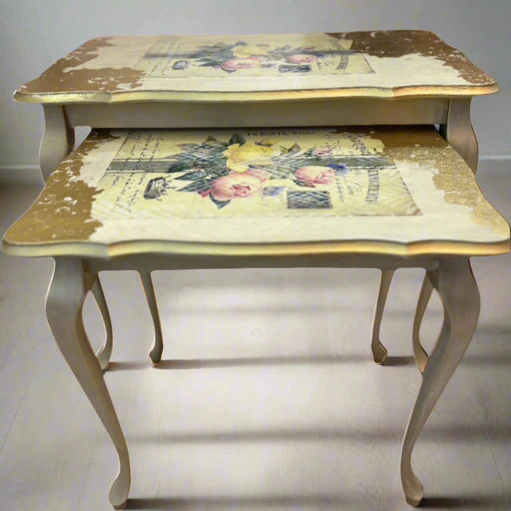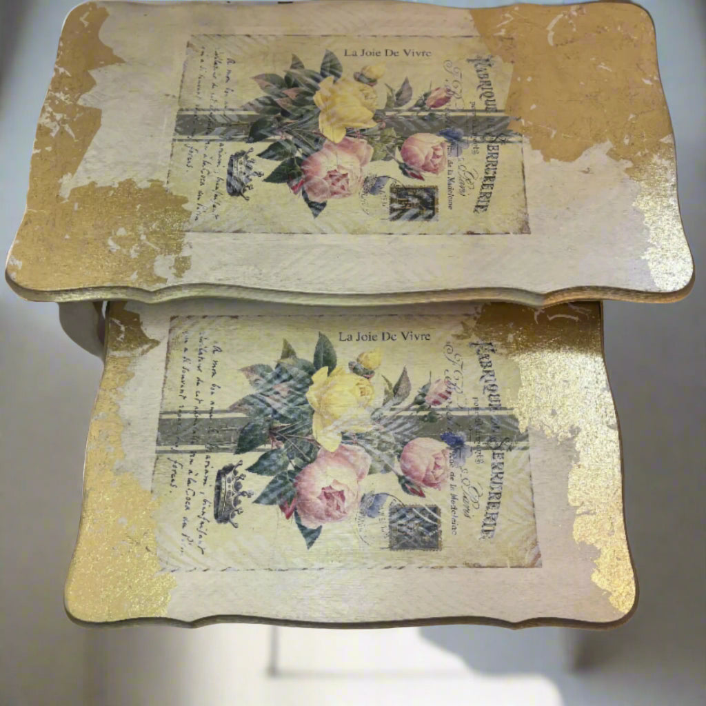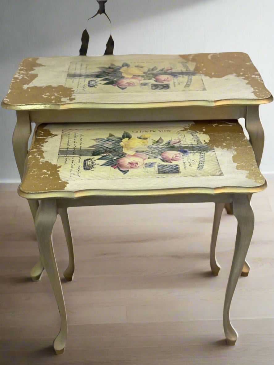 Добавете изискан ретро акцент в своя дом с този изключителен комплект винтидж масички, изработени с внимание към всеки детайл. Вдъхновени от френската романтика и класическите интериори, тези масички съчетават практичност с неподражаем артистичен стил.