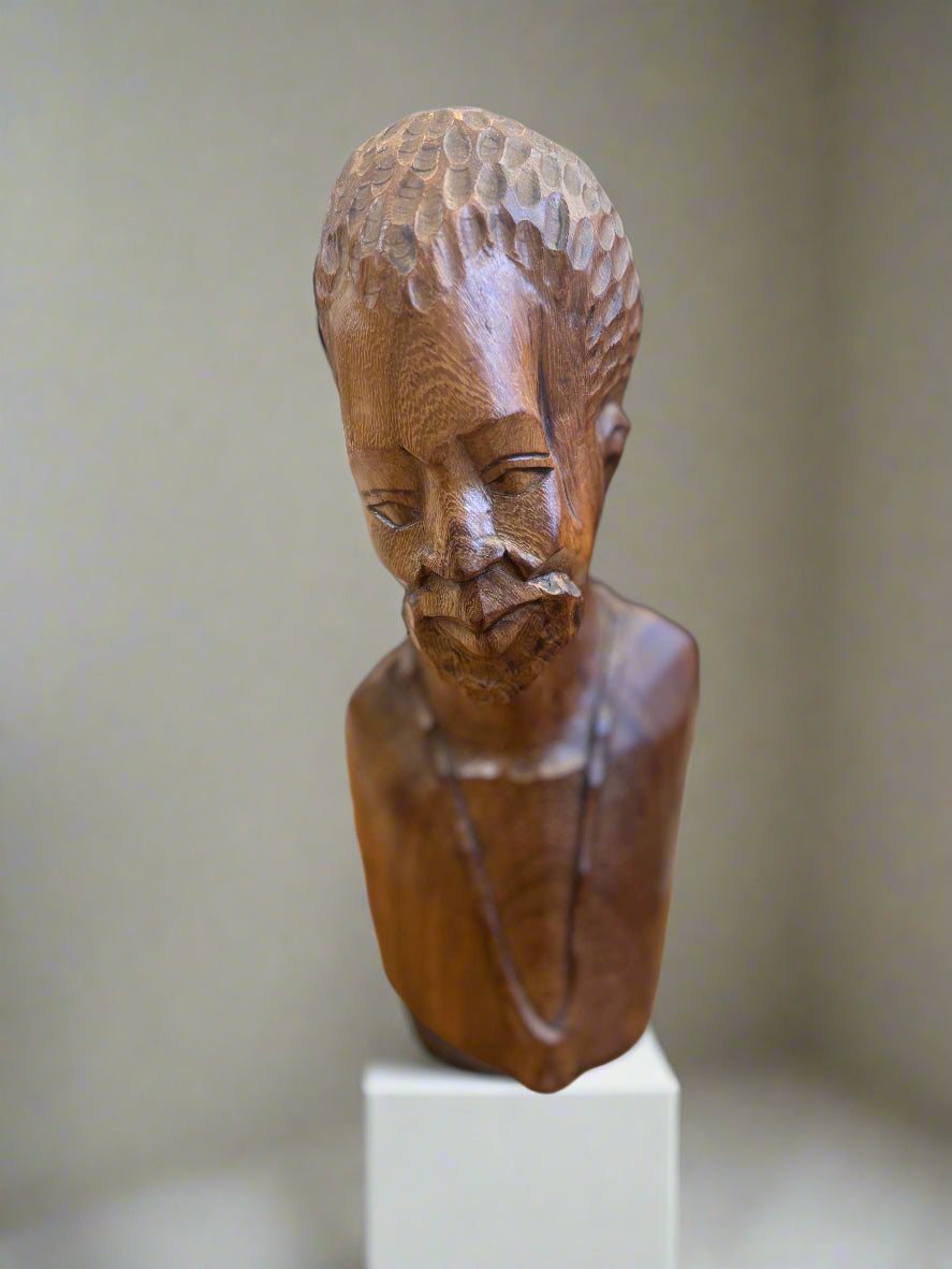 Бюстът изобразява зрял мъж с дълбок поглед и изразителна мимика. Формата на главата и структурата на лицето са стилизирани по начин, характерен за африканското изкуство – с подчертана духовност и уважение към идентичността.