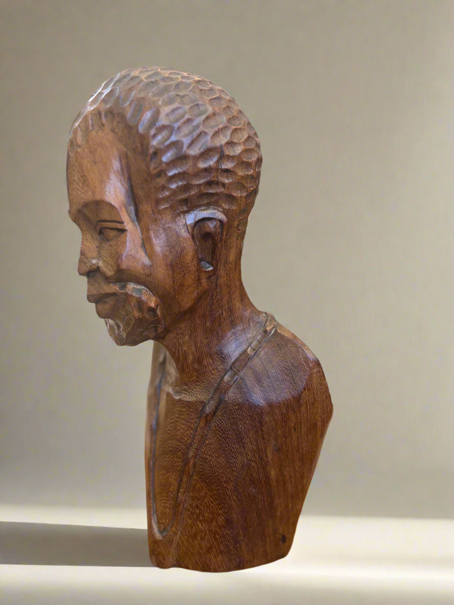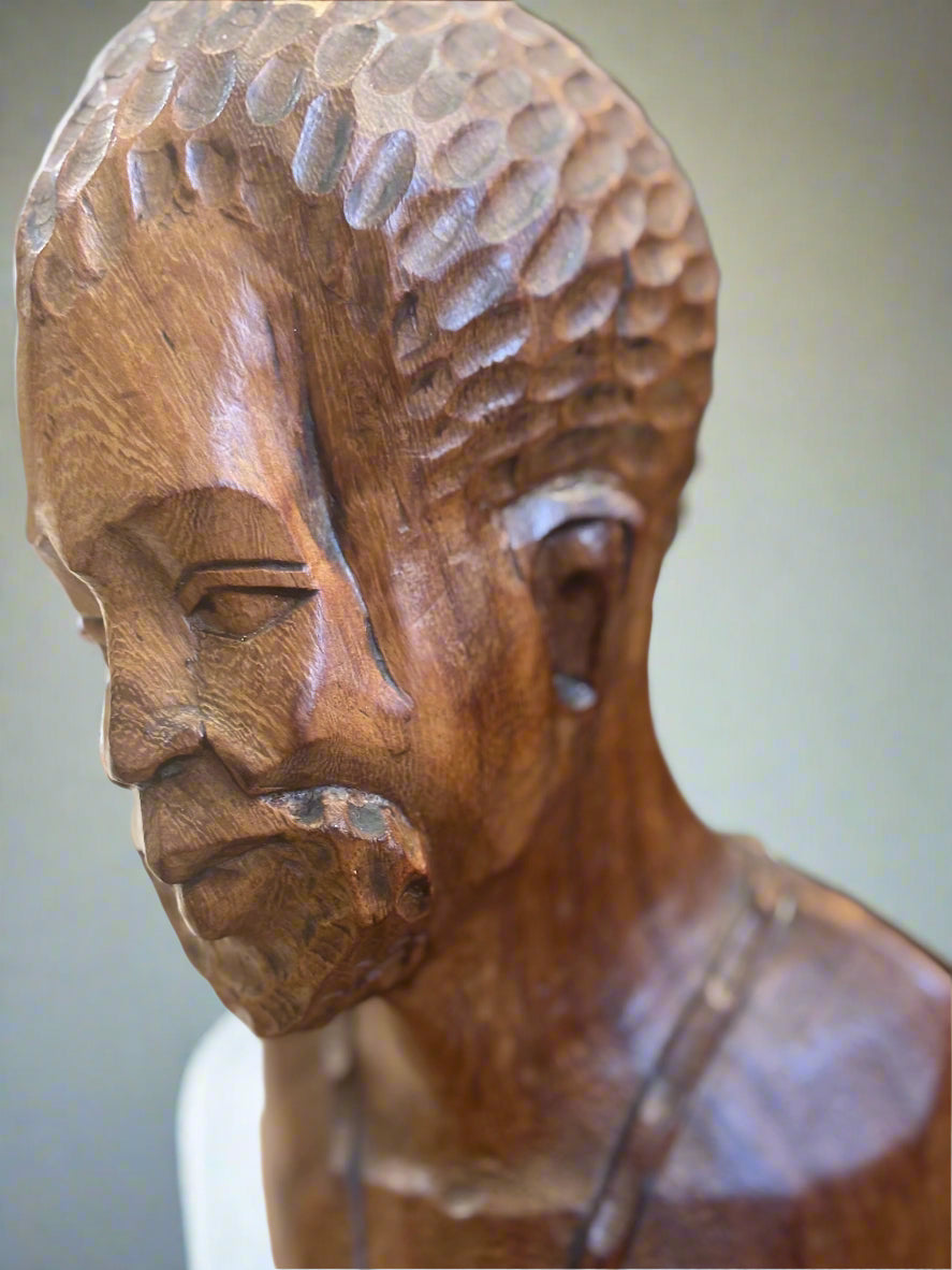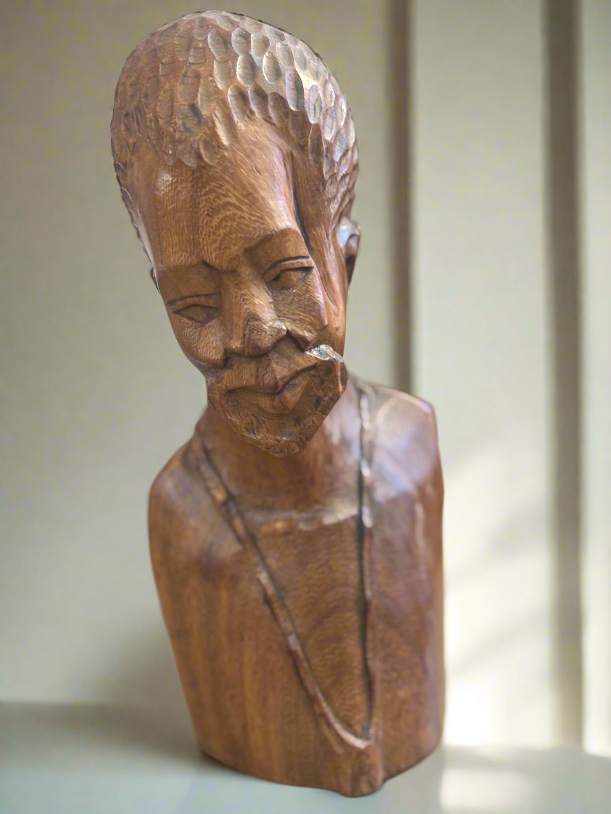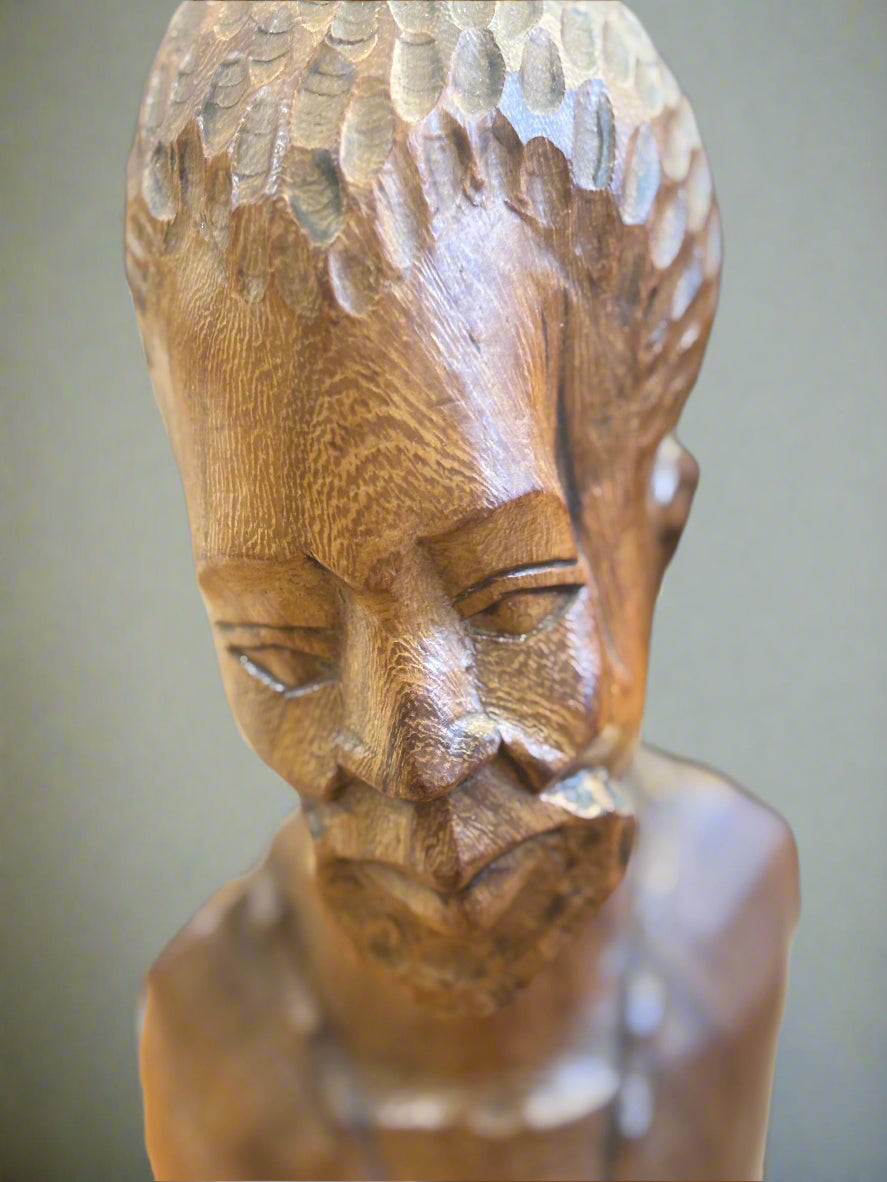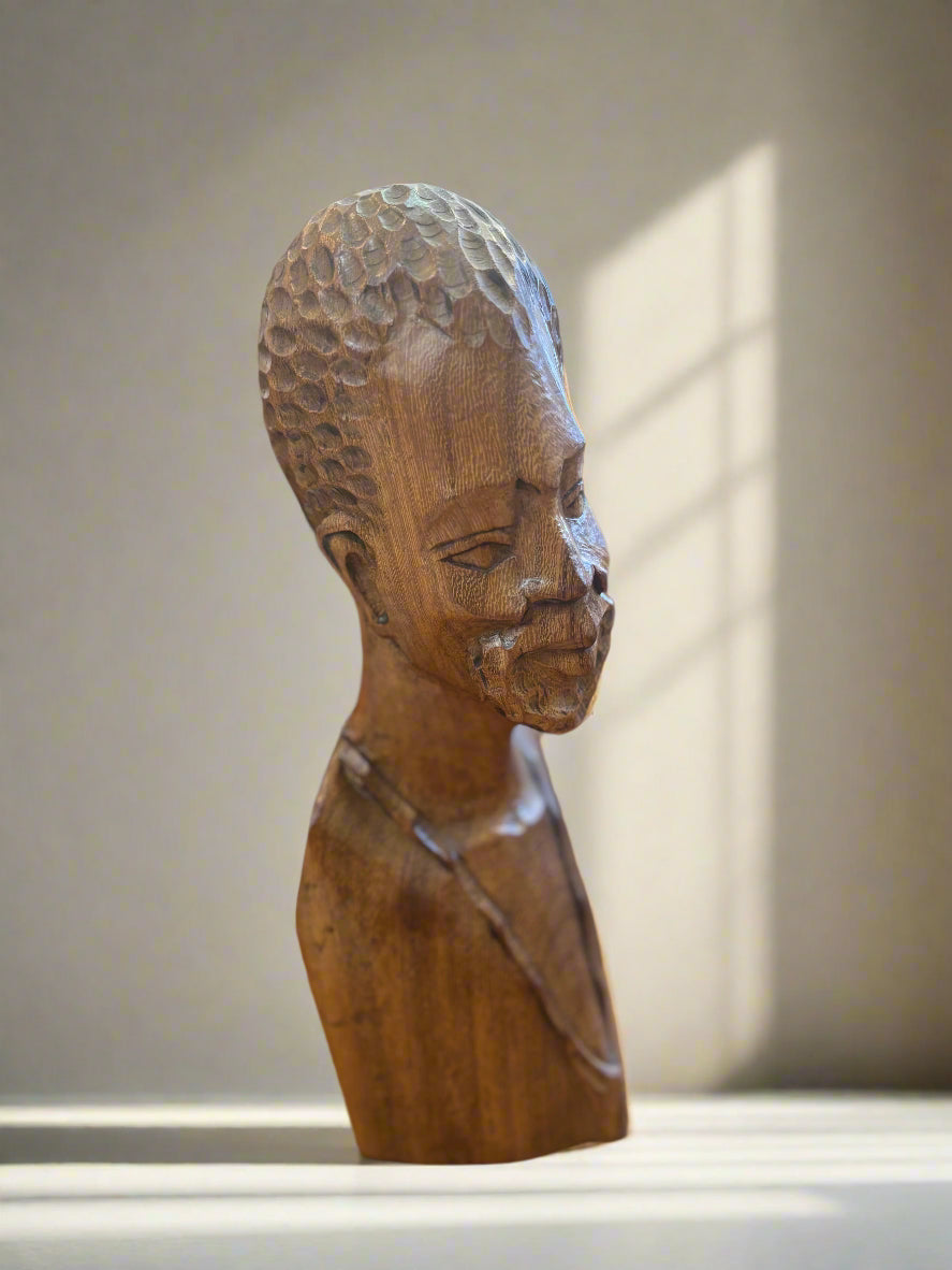 Емоционален и детайлно изработен ръчен дърворезбован бюст, представящ мъжка фигура с характерно излъчване и изразителни черти. Този артистичен обект носи в себе си дълбочината на африканската култура и уважение към занаятчийското майсторство.