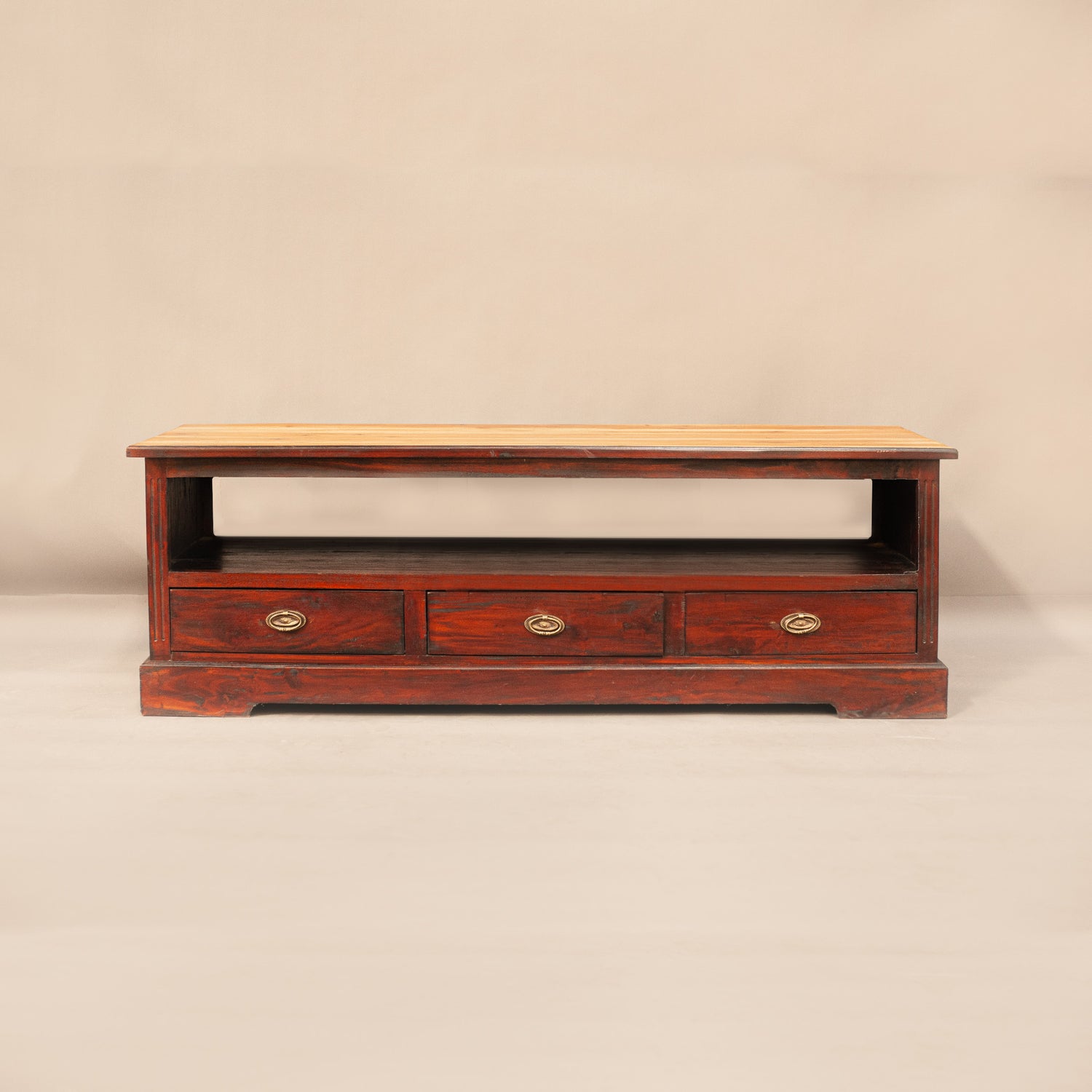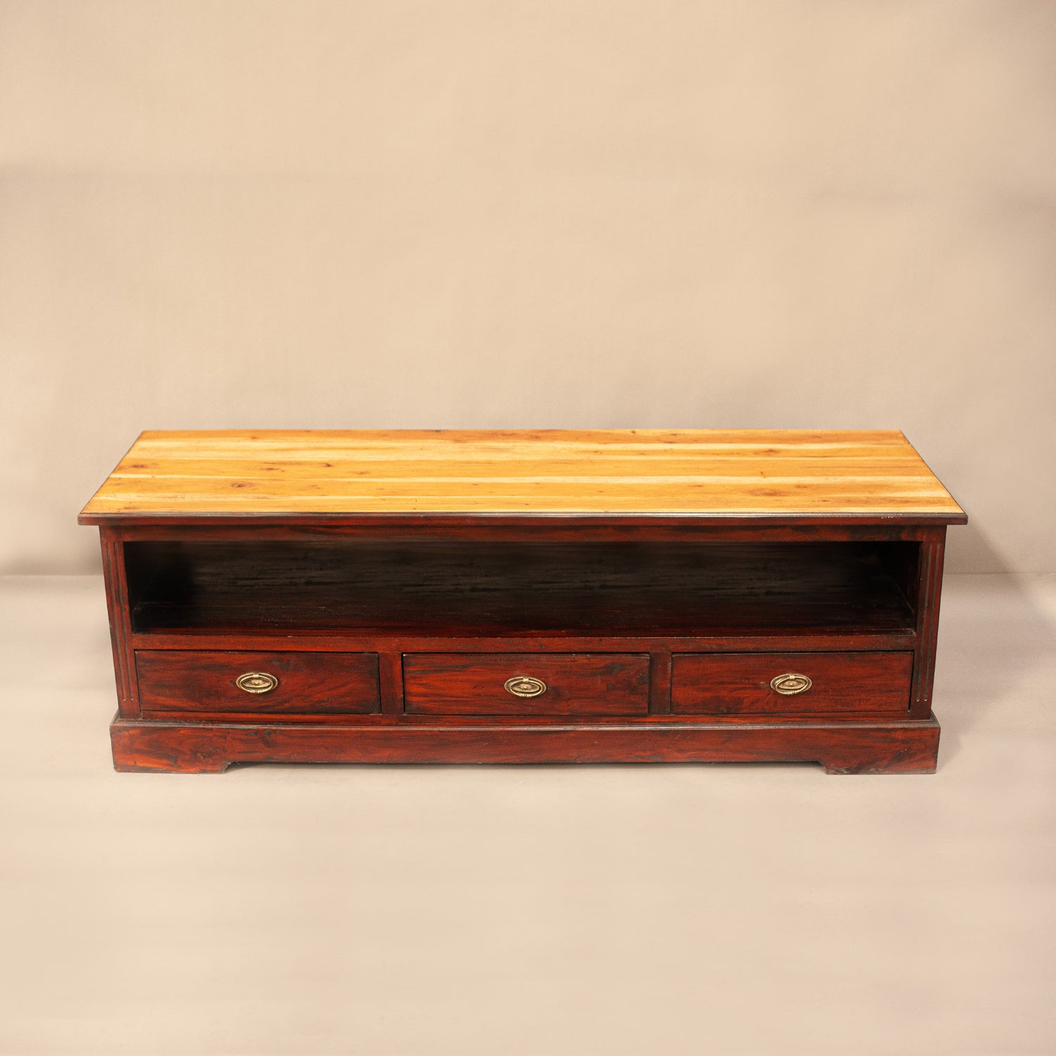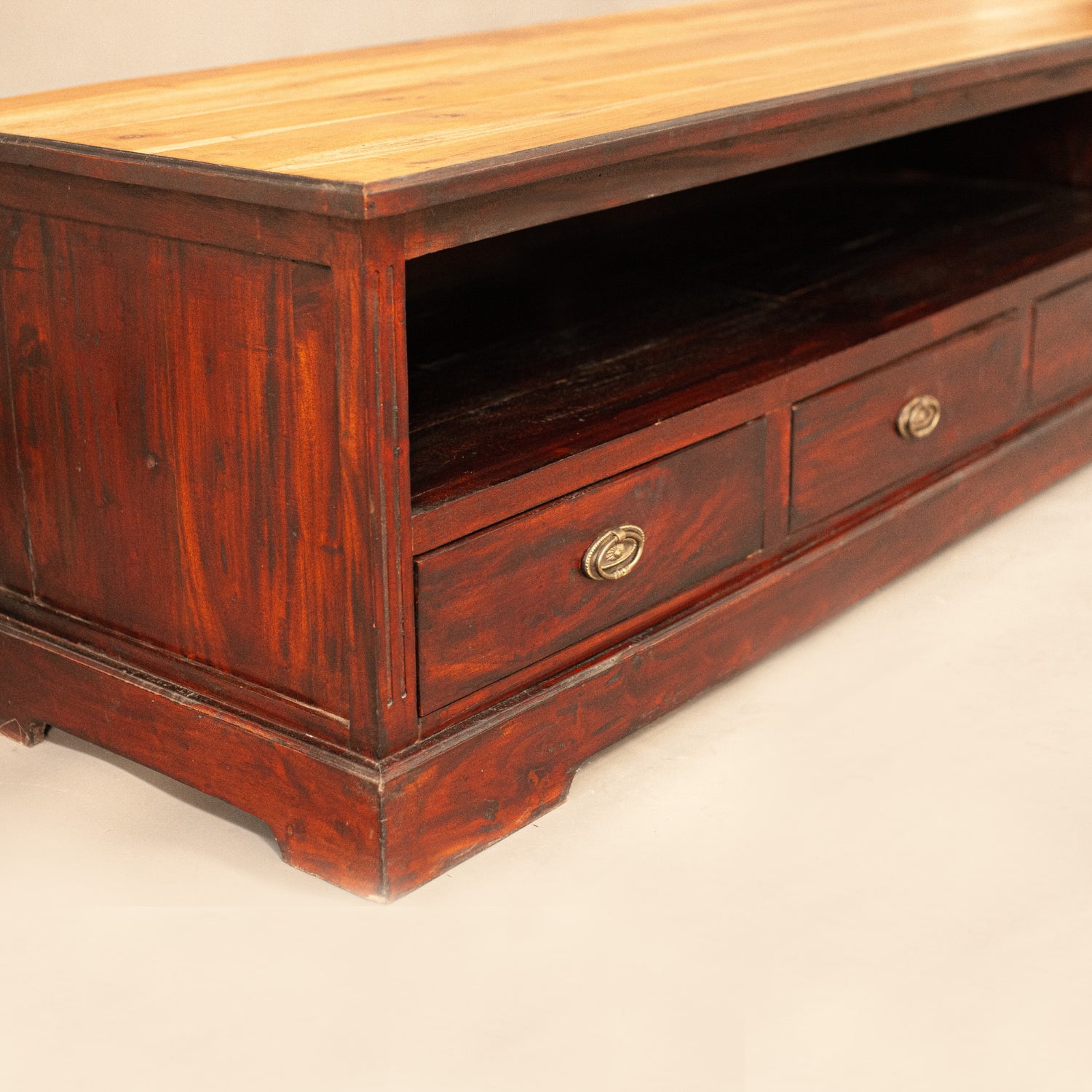 Нисък шкаф от пълен масив с три чекмеджета, подходящ за ТВ шкаф.
