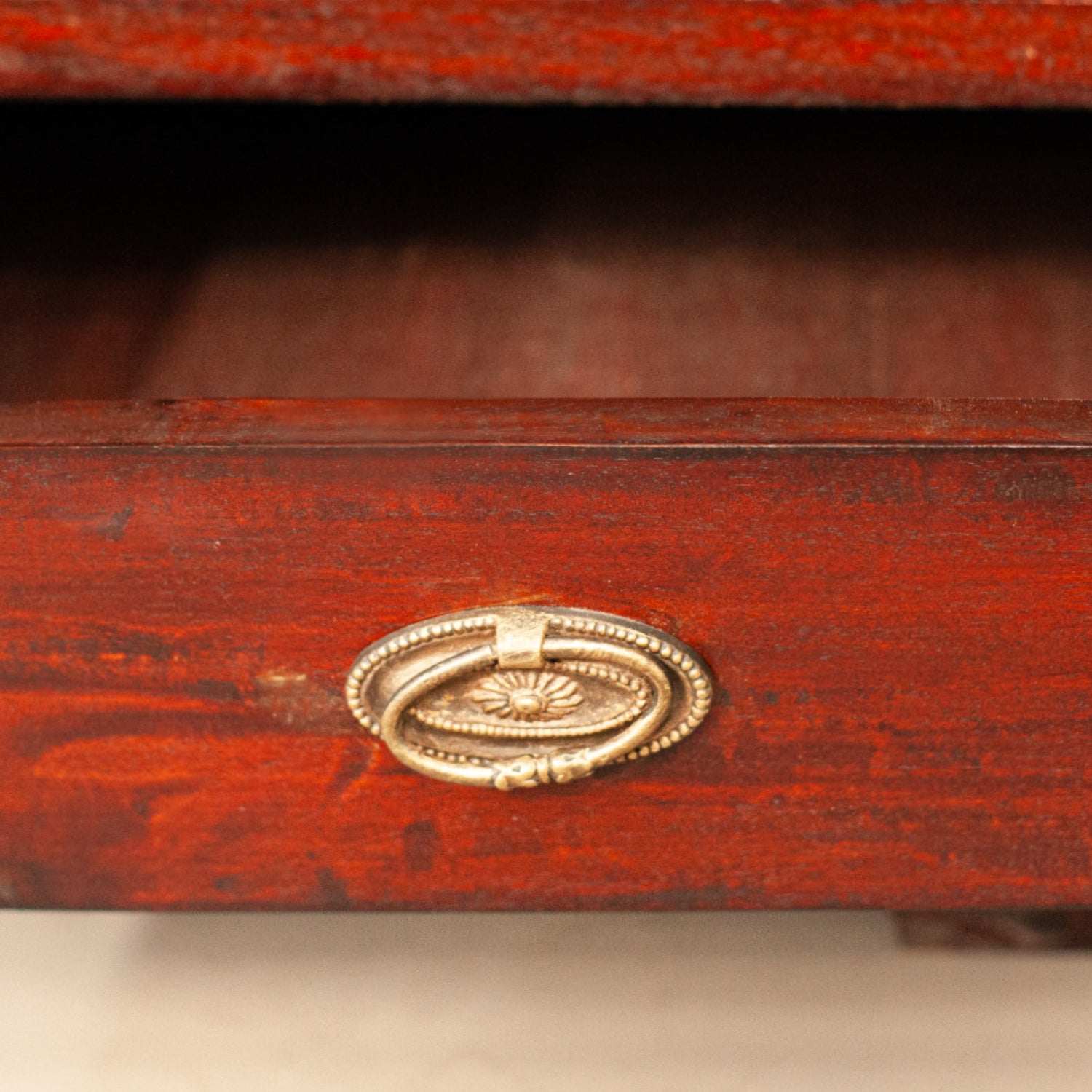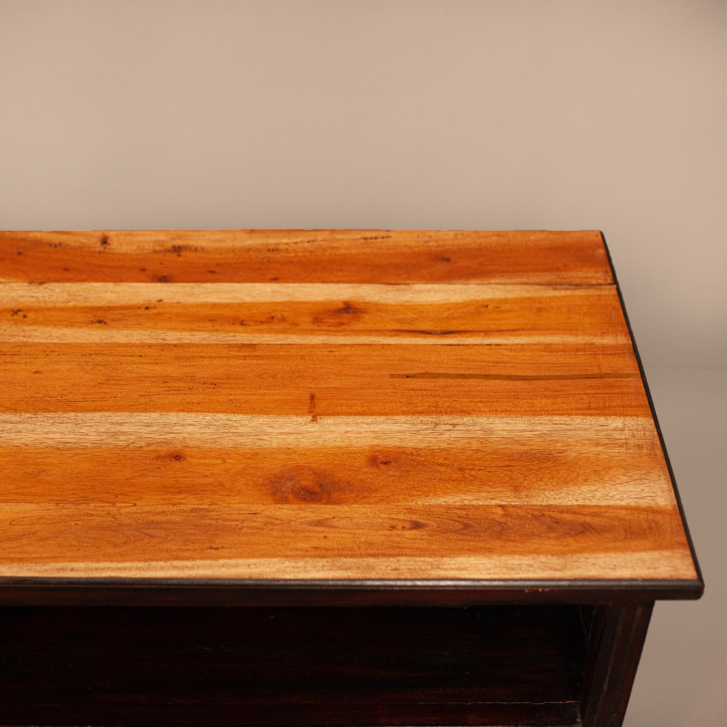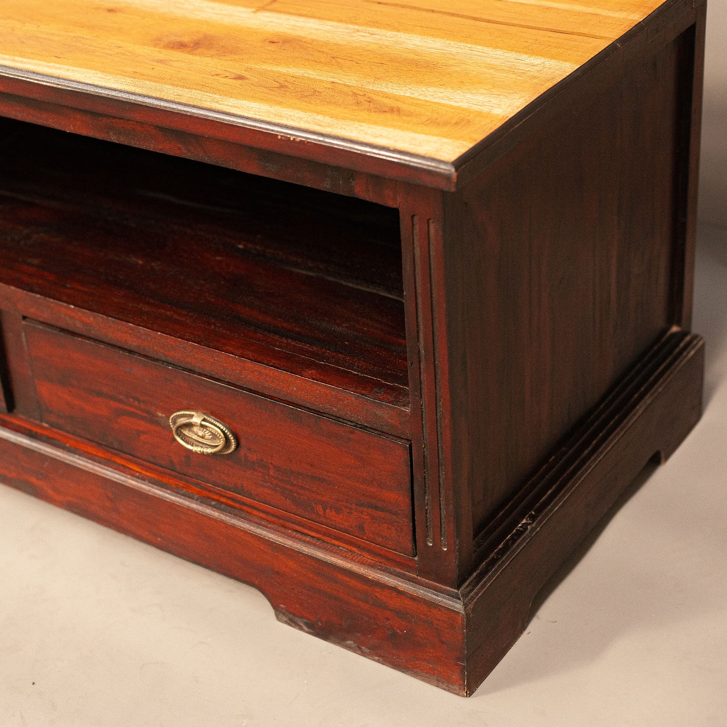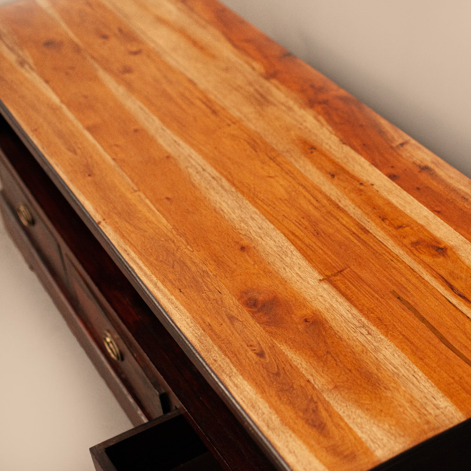 Нисък шкаф от пълен масив с три чекмеджета, подходящ за ТВ шкаф.