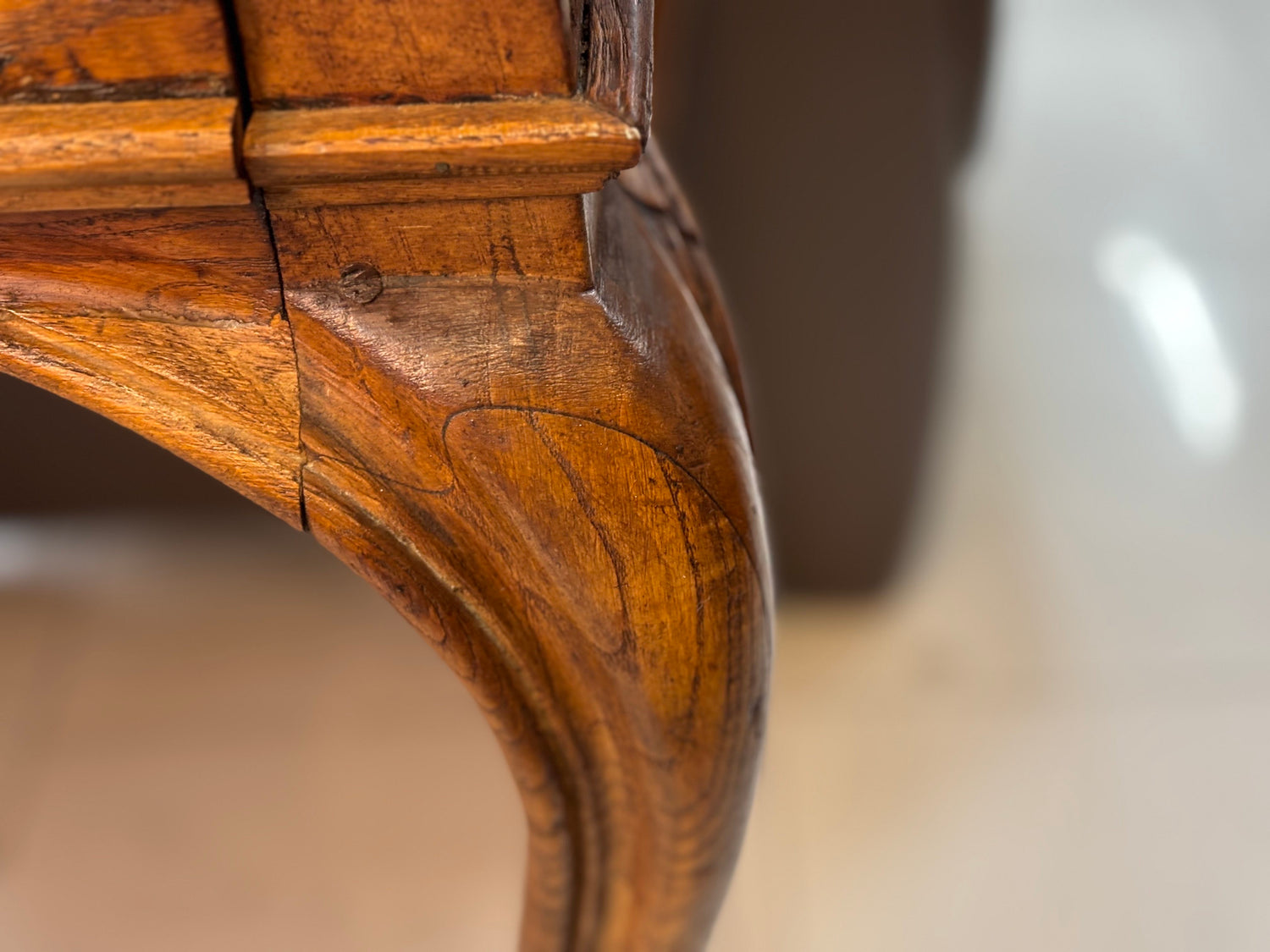 Изящна френска маса, ръчно изработена в стил Луи XV, средата на XVIII в., с характерни извити крака тип „кабриол“ и елегантен профил, едно чекмедже. Изработена от масивна дървесина /дъб, орех/. Подходяща както за интериор с класическа естетика, така и като акцент в съвременен дом. В много добро състояние, предвид възрастта си, с красива патина на дървото.