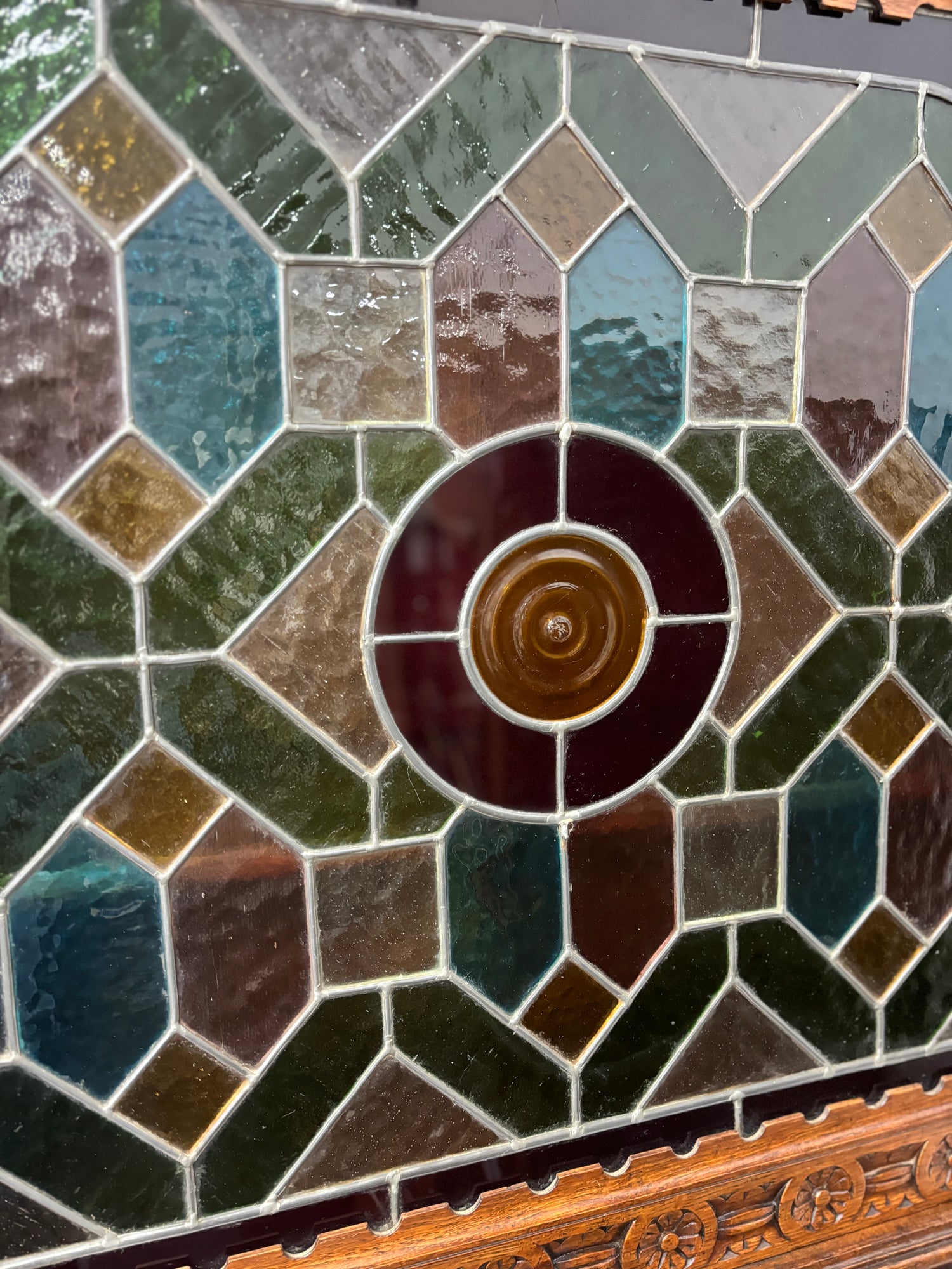 Невероятната ръчна изработка на дърворезбата се допълва от красиво многоцветно витражно стъкло. Един стилен античен елемент за вашия дом.