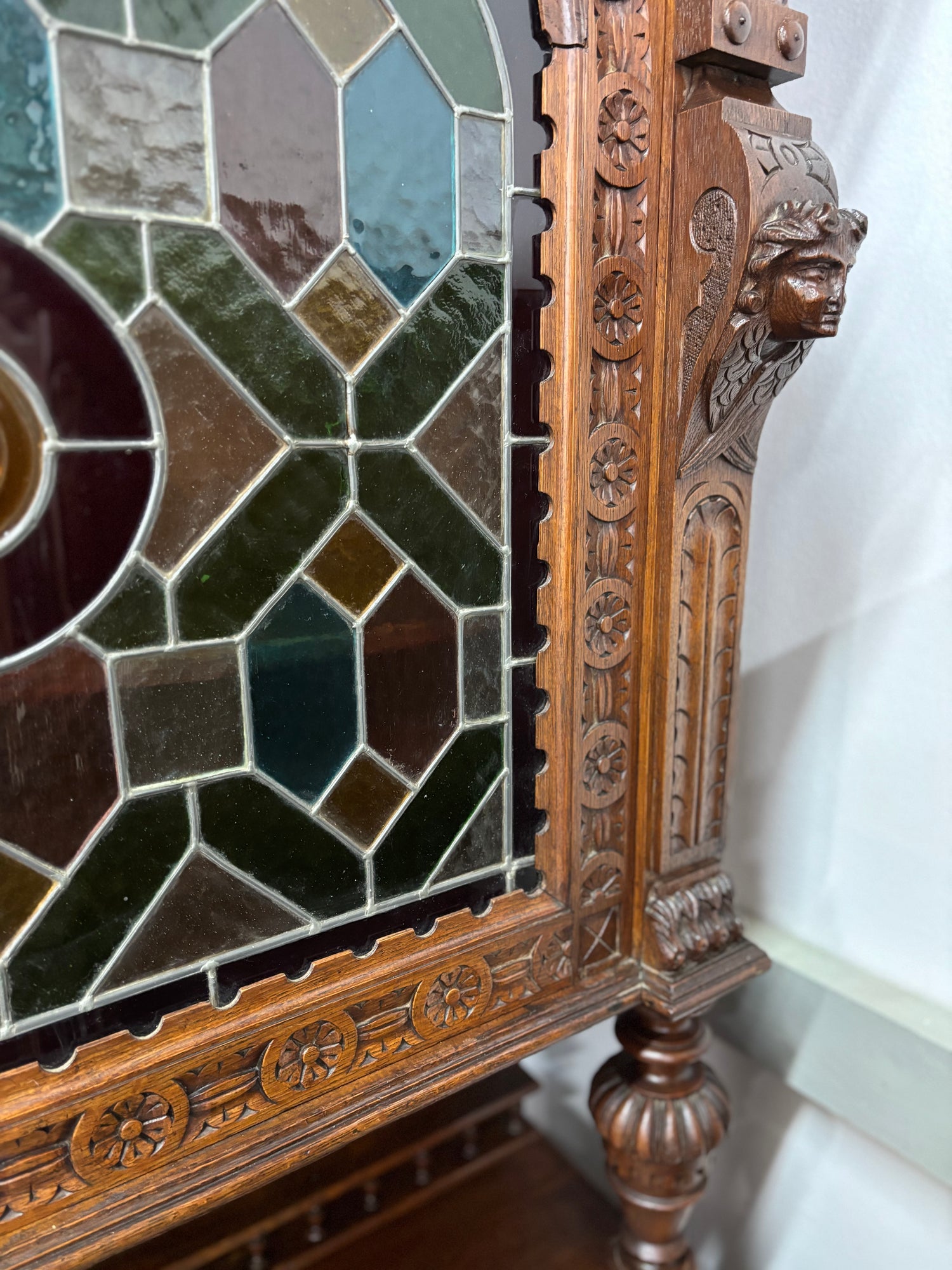 Резбован античен шкаф от масивен дъб с витраж в стил неоренесанс. Нидерландия.