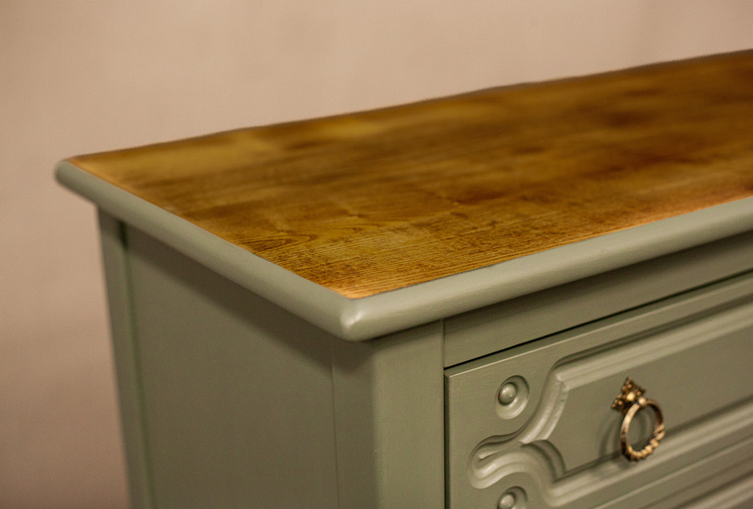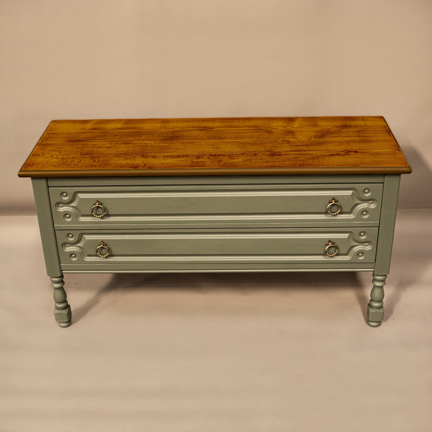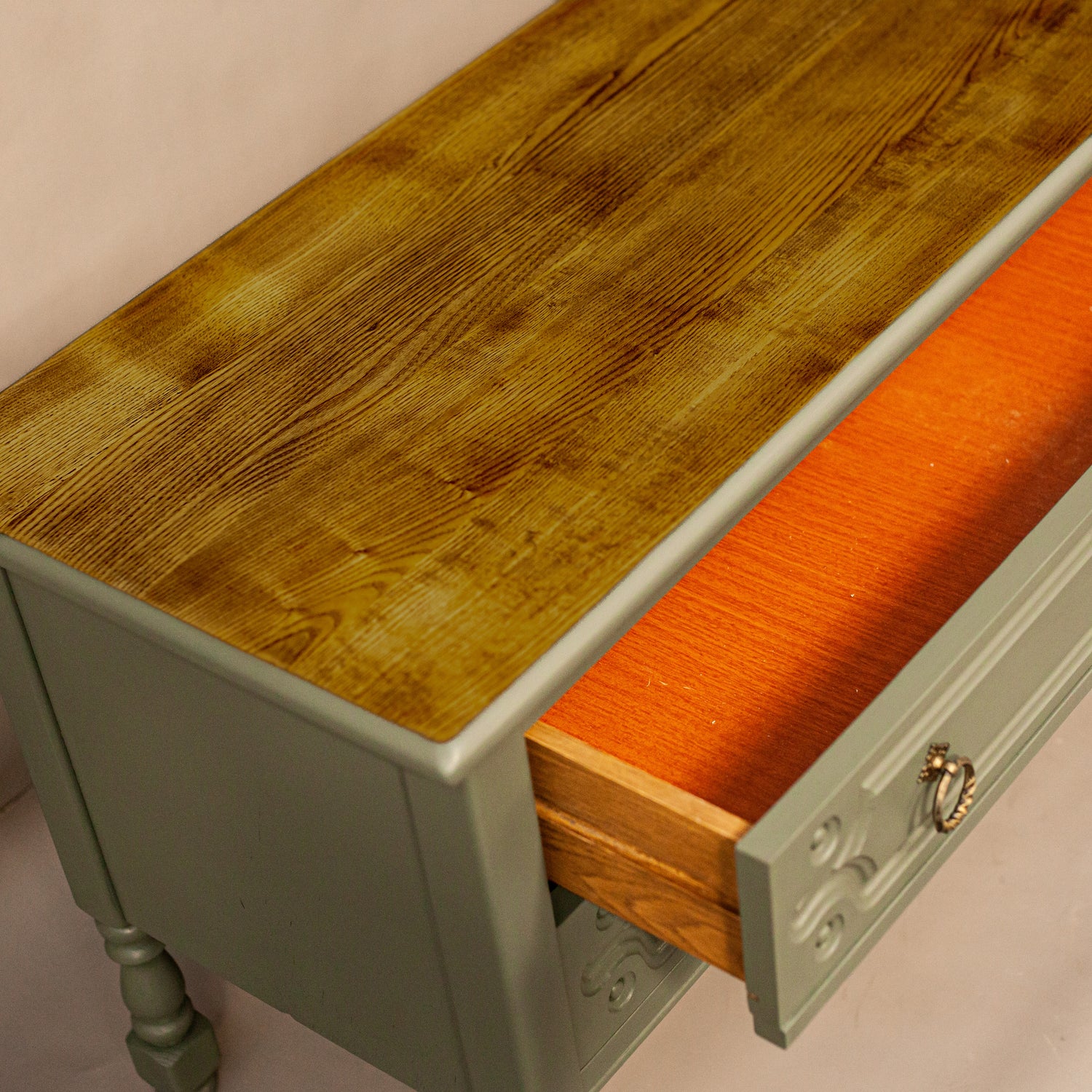 Красив малък скрин с две чекмеджета , оригинален обков и плот от естествено дърво. Скринът е реновиран в свежо маслинено зелен цвят за постигане на по-модерна визия. Подходящ е за съхранение както за спалня така и за детска стая.