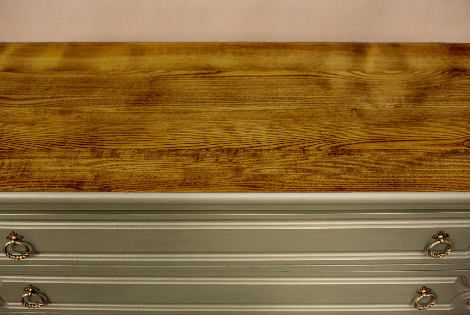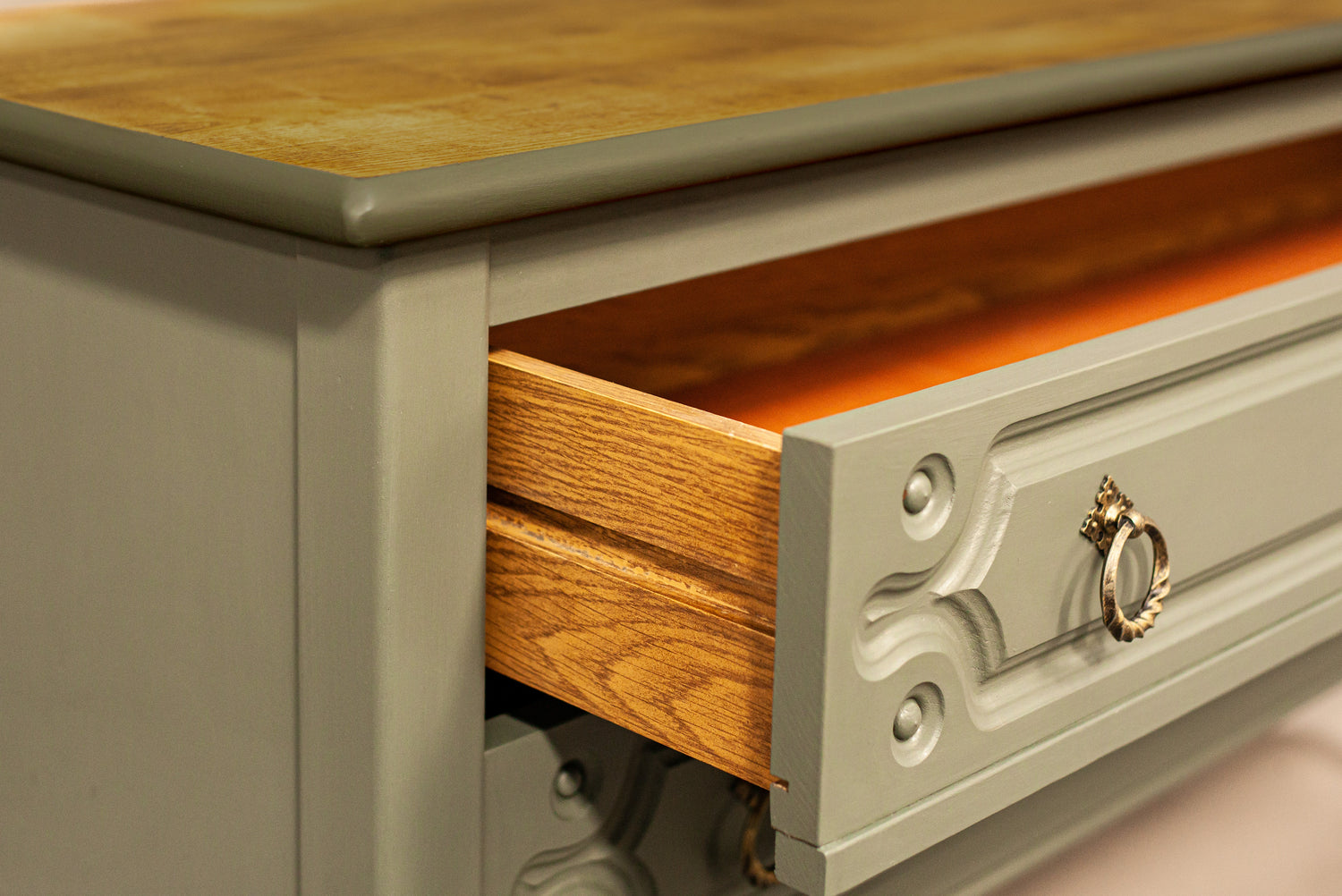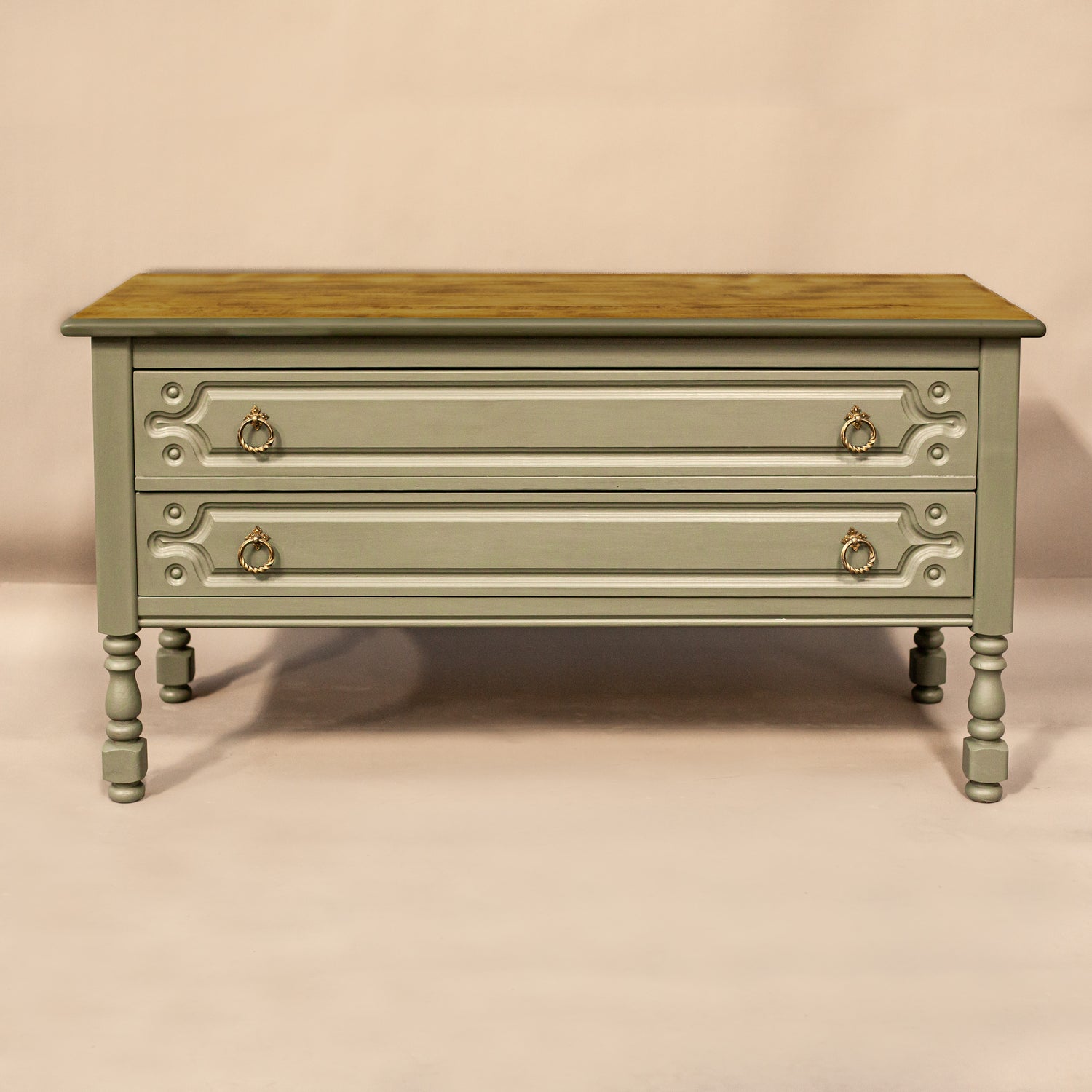 Красив малък скрин с две чекмеджета , оригинален обков и плот от естествено дърво. Скринът е реновиран в свежо маслинено зелен цвят за постигане на по-модерна визия. Подходящ е за съхранение както за спалня така и за детска стая.